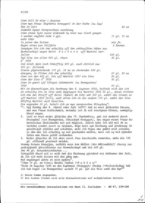 Rechnung von Beat II. Zurlauben für Melchior Honegger, selig, Gastwirt zum Engel, in Bremgarten