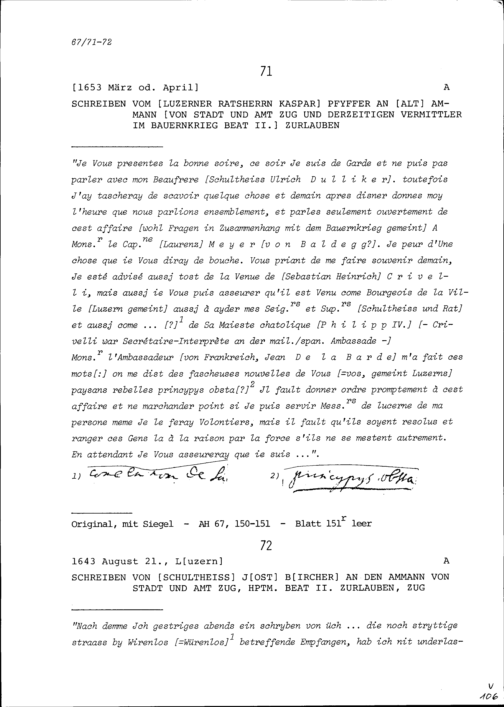 Schreiben von Kaspar Pfyffer, Luzerner Ratsherr, an Beat II. Zurlauben, Altammann von Stadt und Amt Zug und Vermittler im Bauernkrieg