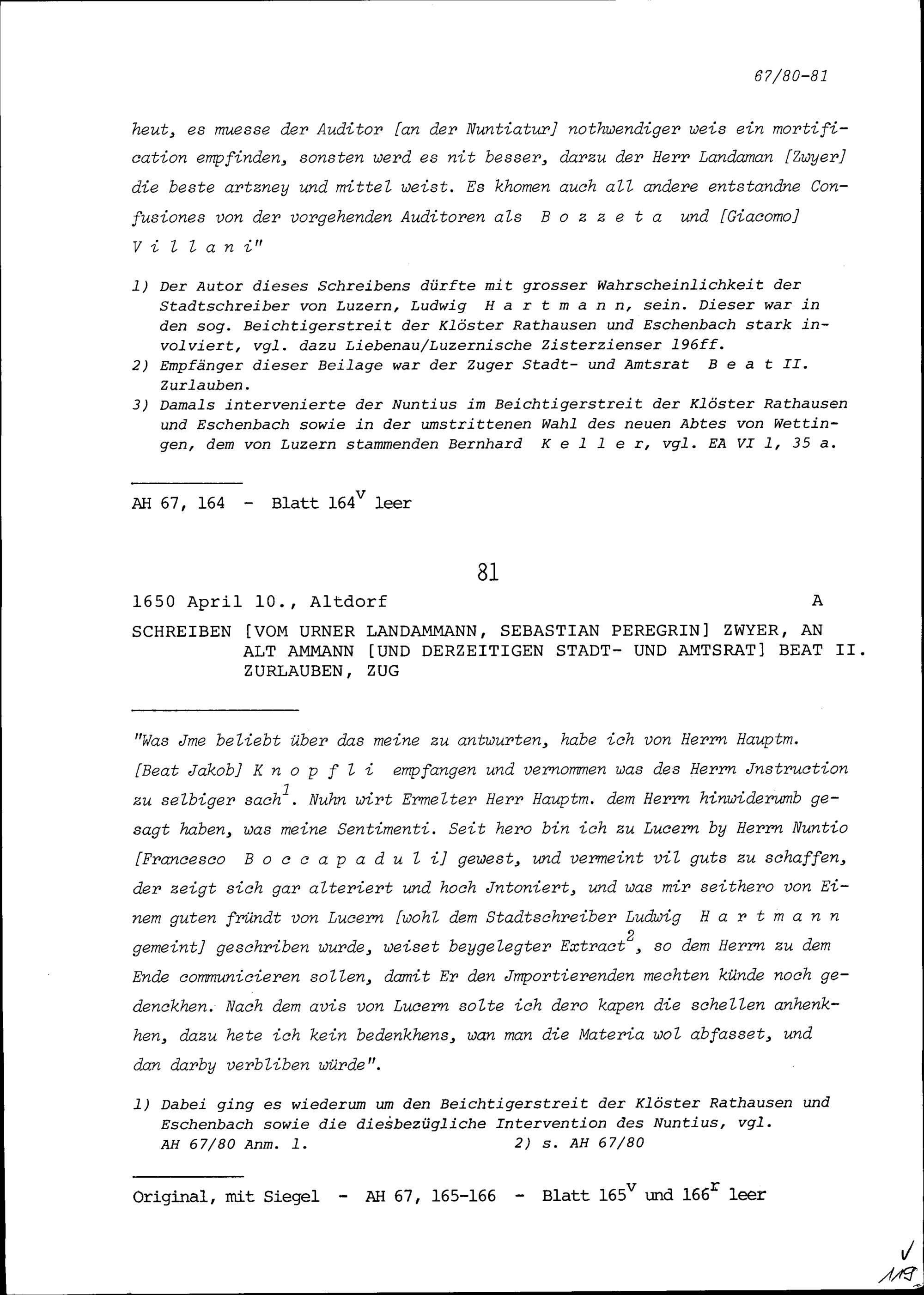 Schreiben von Sebastian Peregrin Zwyer, Urner Landammann, an Beat II. Zurlauben,...