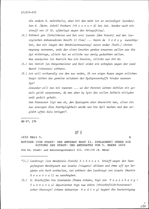 Notiz von Beat II. Zurlauben, Stadt- und Amtrat, über die Sitzung des Stadt- und Amtrats vom 5. März 1650