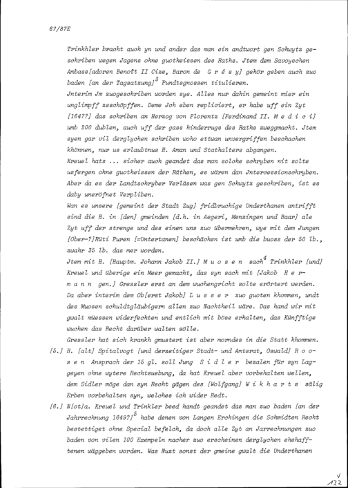 Notiz von Beat II. Zurlauben, Stadt- und Amtrat, über die Sitzung des Stadt- und Amtrats vom 5. März 1650