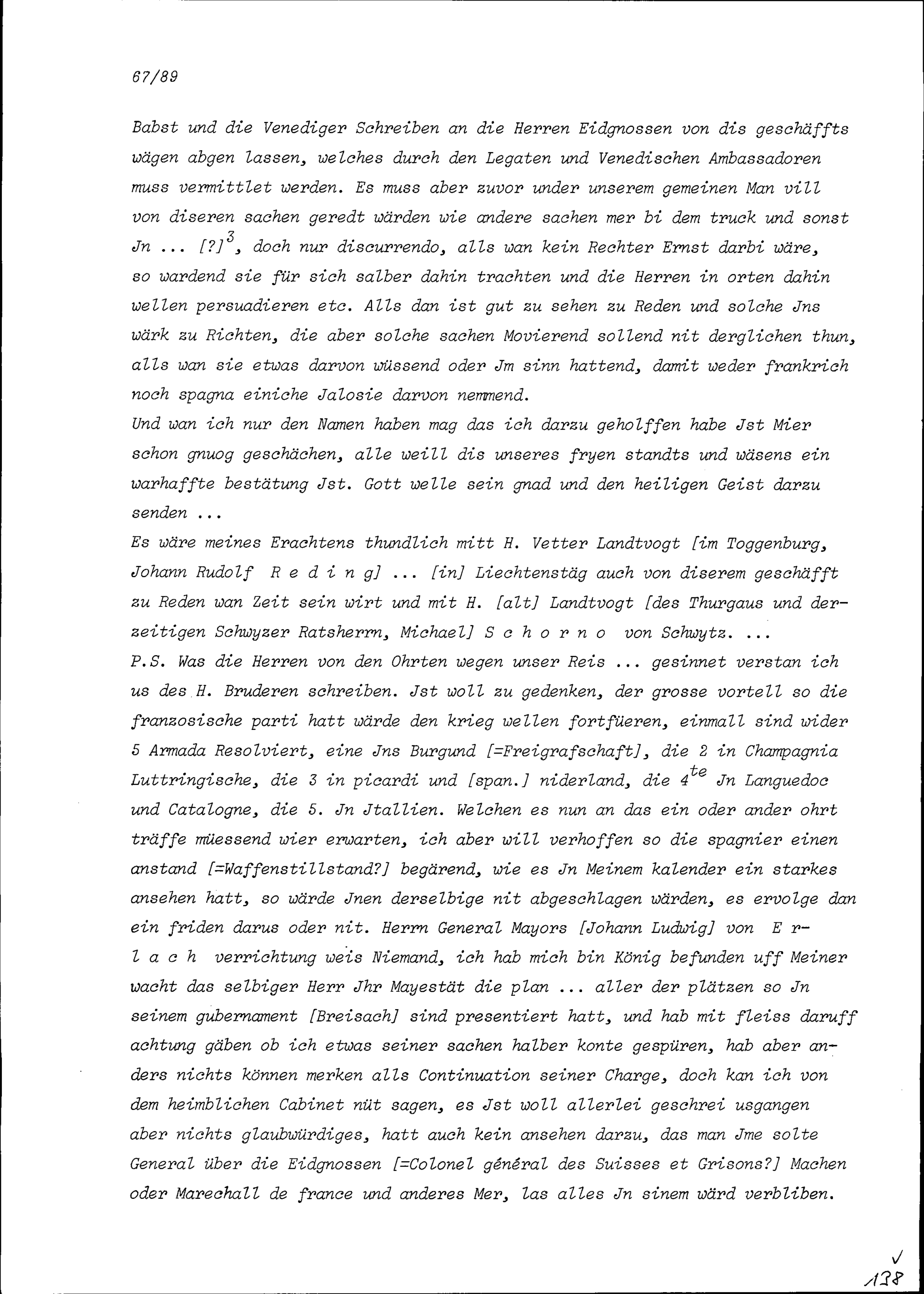 Schreiben von Wolfgang Dietrich Theodor Reding, Gardehauptmann, an Beat II. Zurlauben, Stadt- und Amtrat Zug