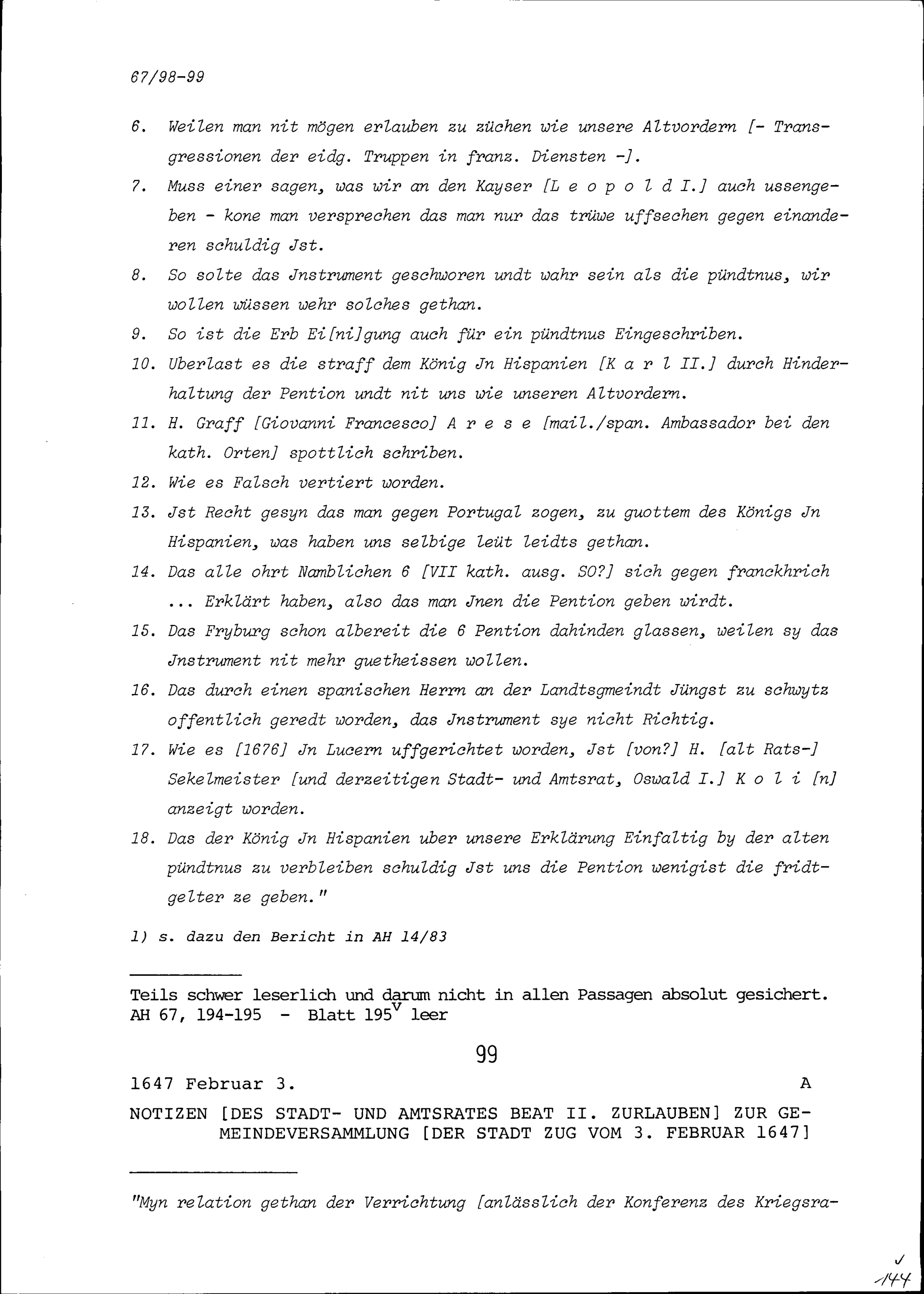 Notiz von Beat II. Zurlauben, Stadt- und Amtrat, zur Gemeindeversammlung der Stadt Zug vom 3. Februar 1647