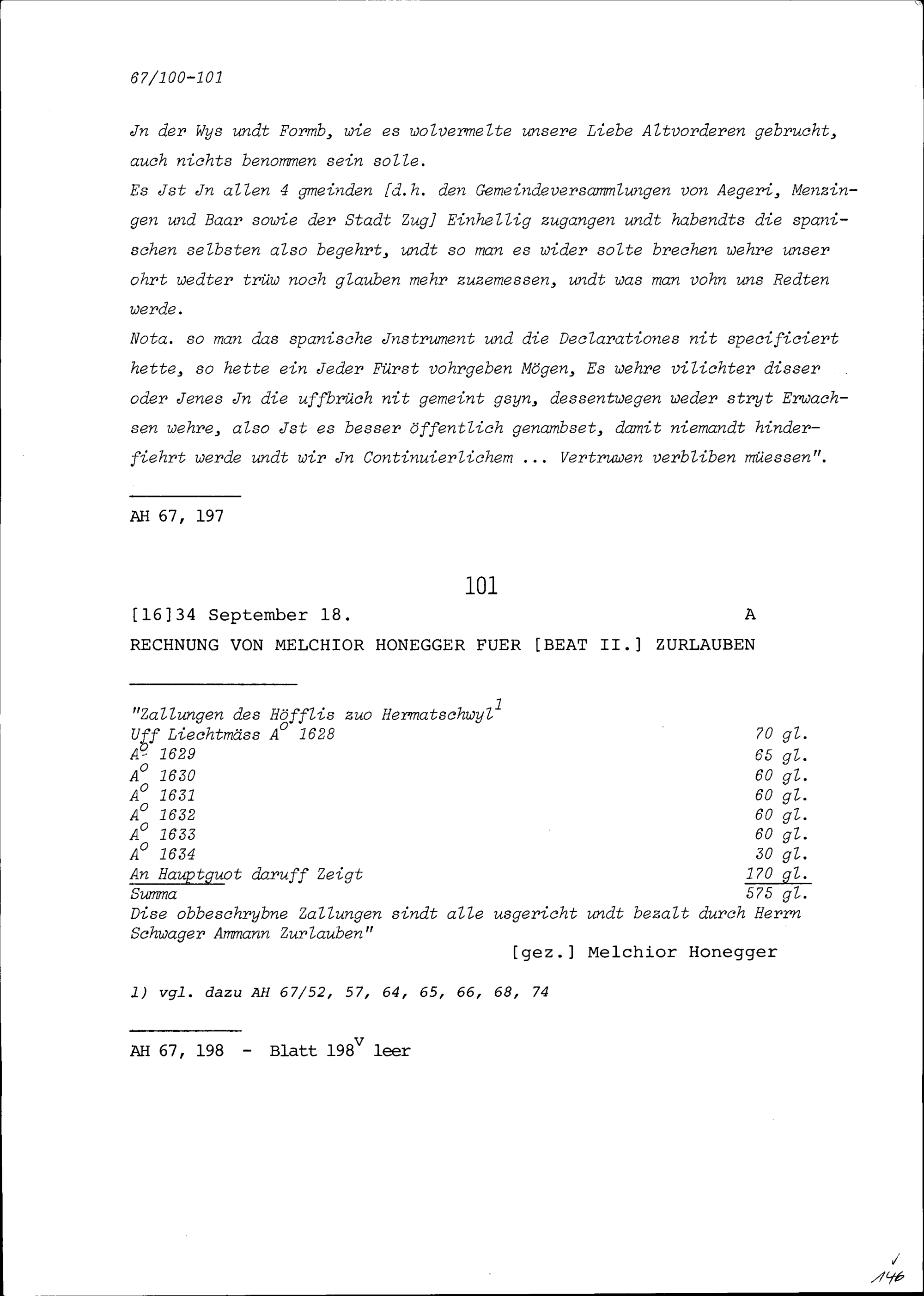 Rechnung von Melchior Honegger für Beat II. Zurlauben