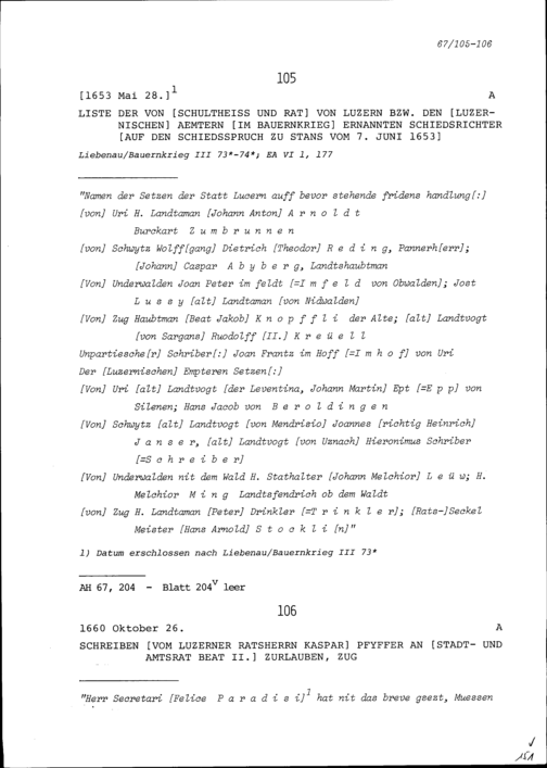 Schiedsrichter, von Schultheiss und Rat Luzern beziehungsweise von den luzernischen Ämter im Bauernkrieg ernannt, auf den Schiedsspruch in Stans vom 7. Juni 1653