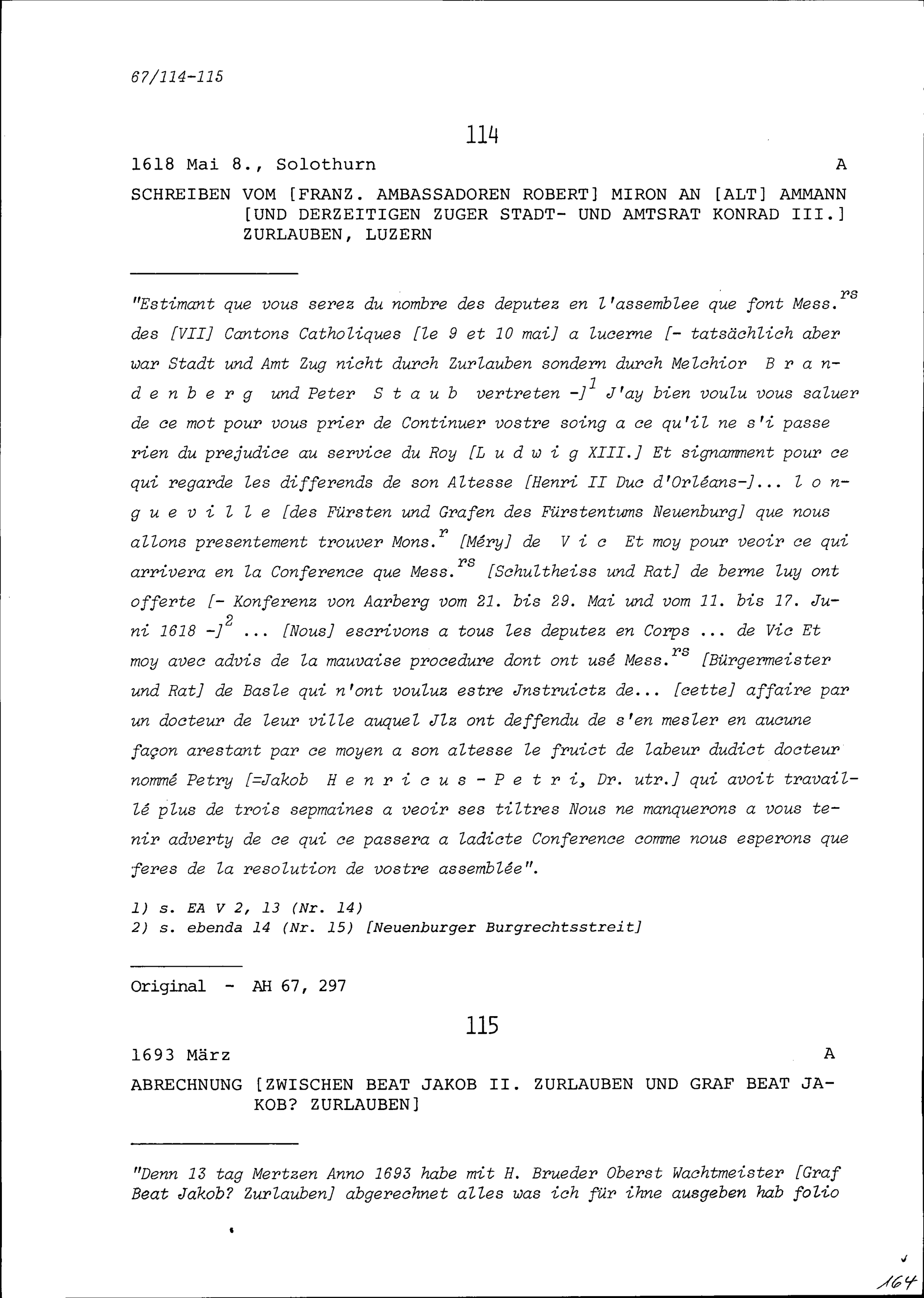 Schreiben von Robert Miron, Ambassador von Frankreich, an Konrad III. Zurlauben,...