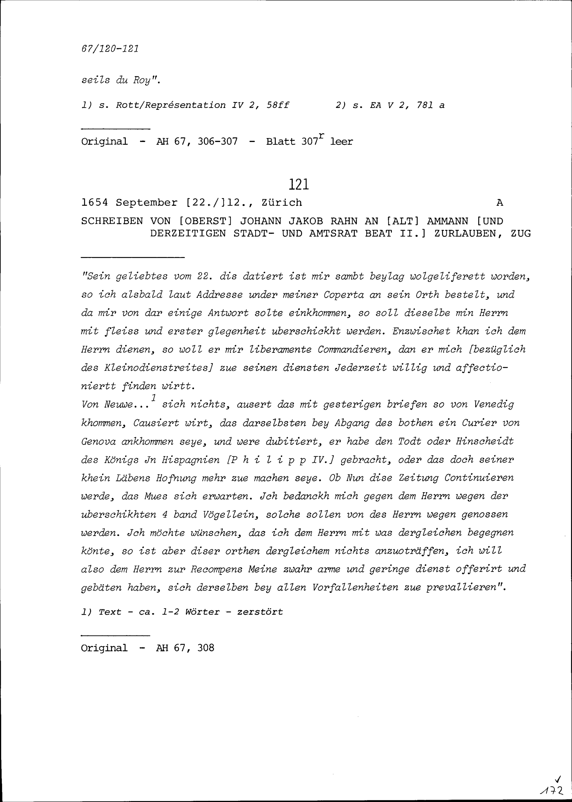 Schreiben von Johann Jakob Rahn, Oberst, an Beat II. Zurlauben, Altammann und Stadt-...