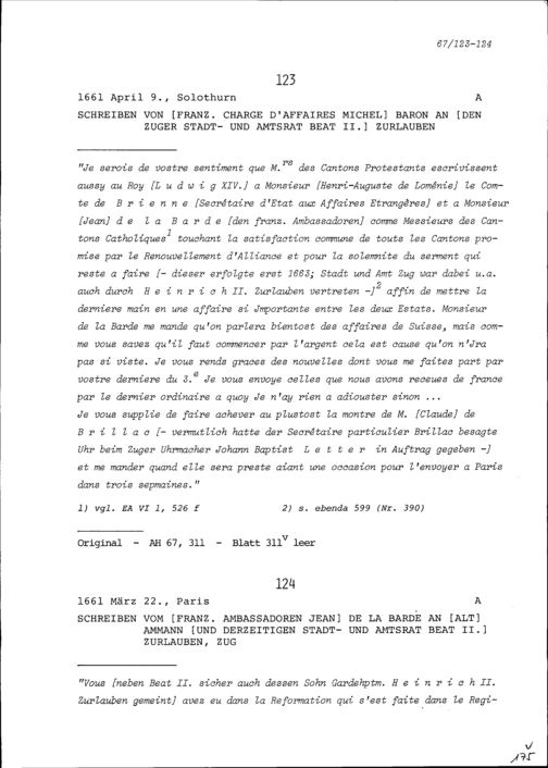 Schreiben von Michel Baron, Geschäftsträger von Frankreich, an Beat II. Zurlauben,...