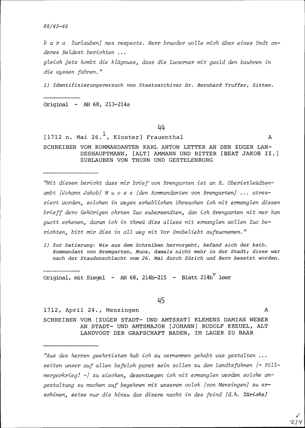 Schreiben von Karl Anton Letter, Kommandant, an Beat Jakob II. Zurlauben, Zuger Landeshauptmann und Altammann