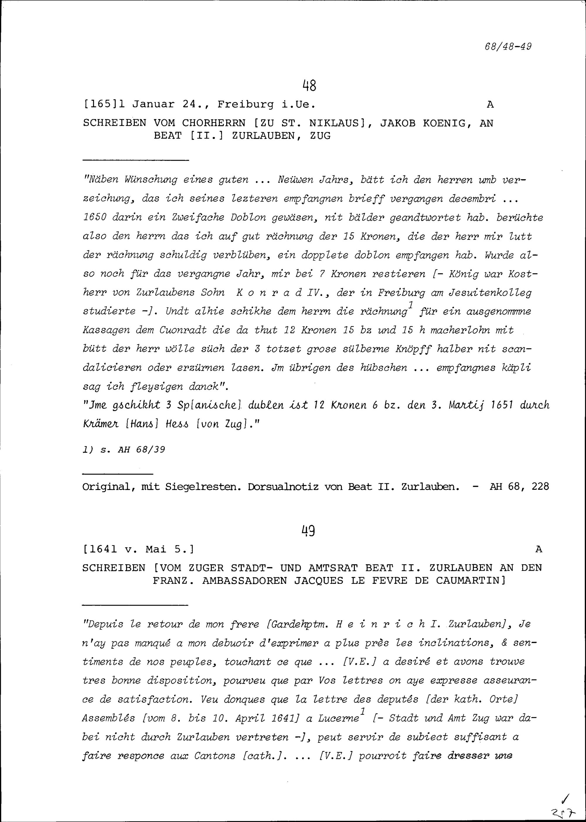 Schreiben von Jakob König, Chorherr zu Sankt Niklaus, an Beat II. Zurlauben, Zug