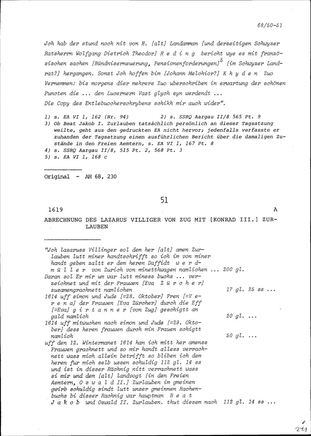 Abrechnung des Lazarus Villiger von Zug mit Konrad III. Zurlauben