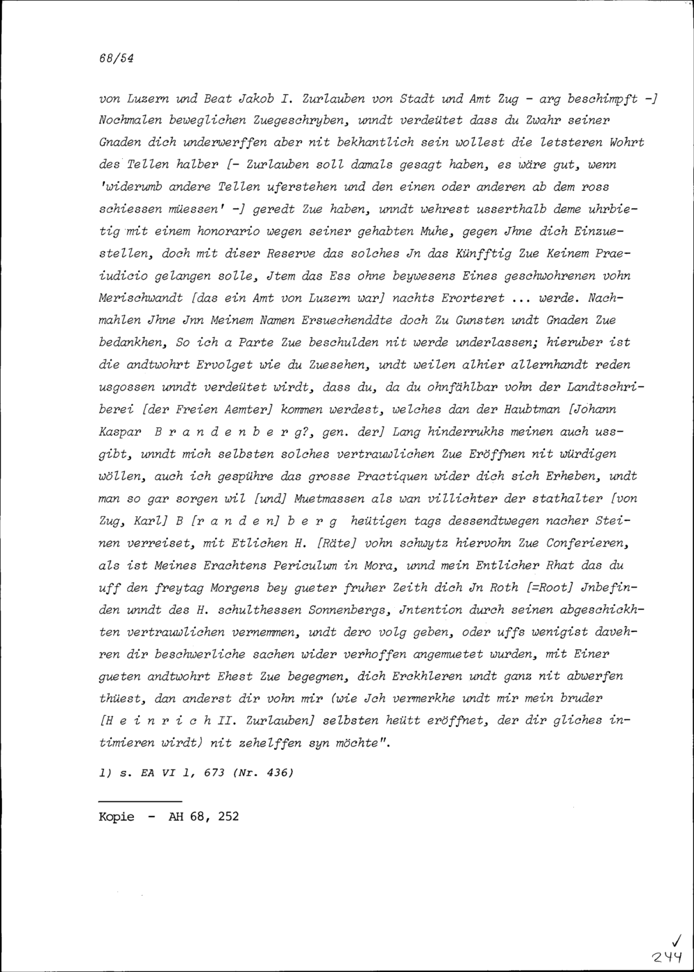 Schreiben von Beat Jakob I. Zurlauben, Stadt- und Amtrat, an Heinrich Ludwig Zurlauben, Landschreiber der Freien Ämter