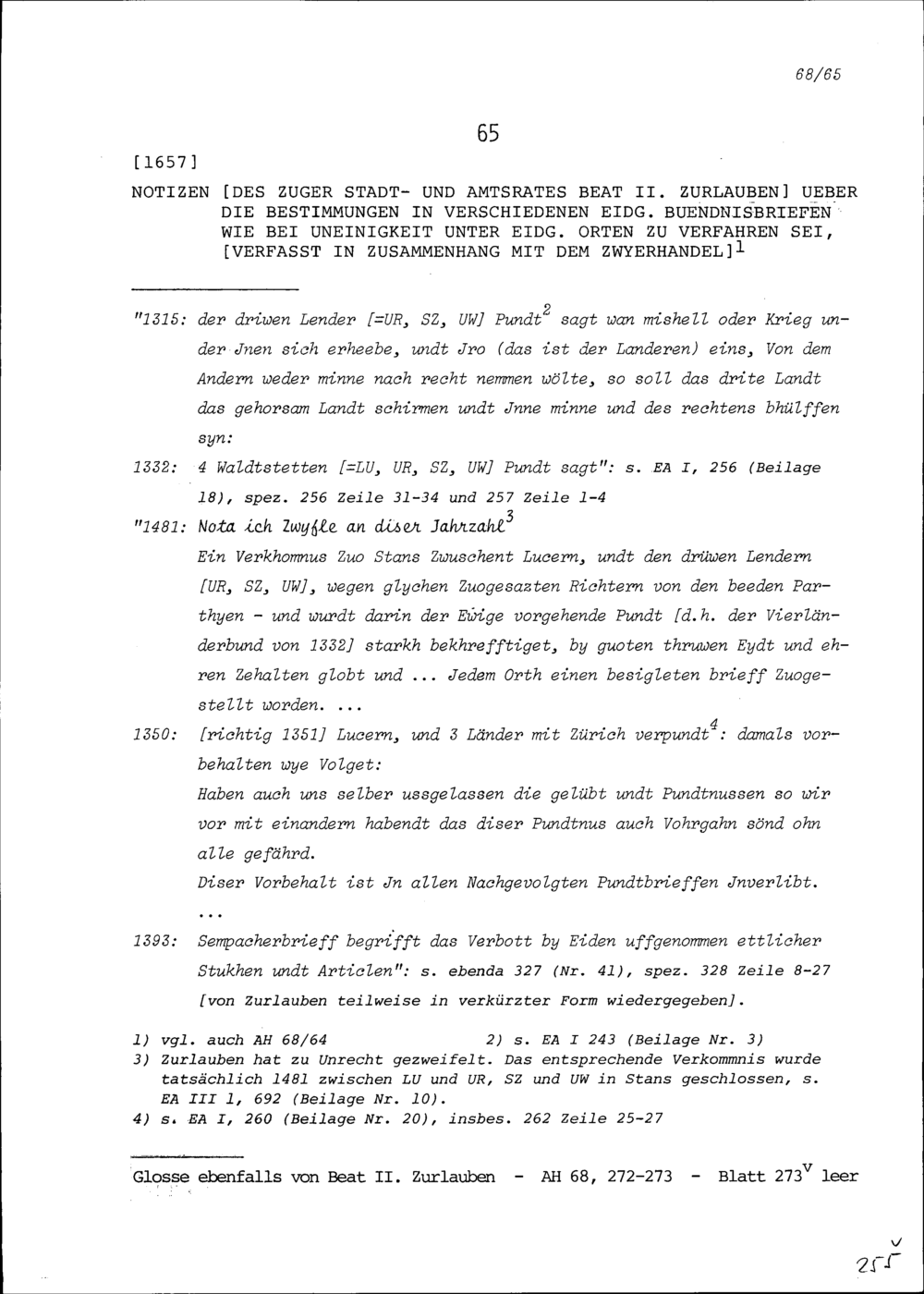 Notiz von Beat II. Zurlauben, Stadt- und Amtrat Zug, über die Bestimmungen in verschiedenen Eidgenössischen Bündnisbriefen wie bei Uneinigkeit unter Eidgenössischen Orten zu Verfahren sei, verfasst in Zusammenhang mit dem Zwyerhandel