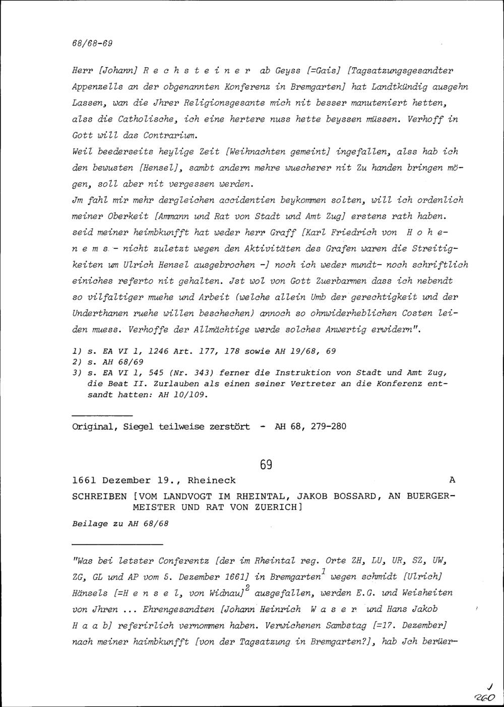 Schreiben von Jakob Bossard, Landvogt im Rheintal, an Bürgermeister und Rat Zürich