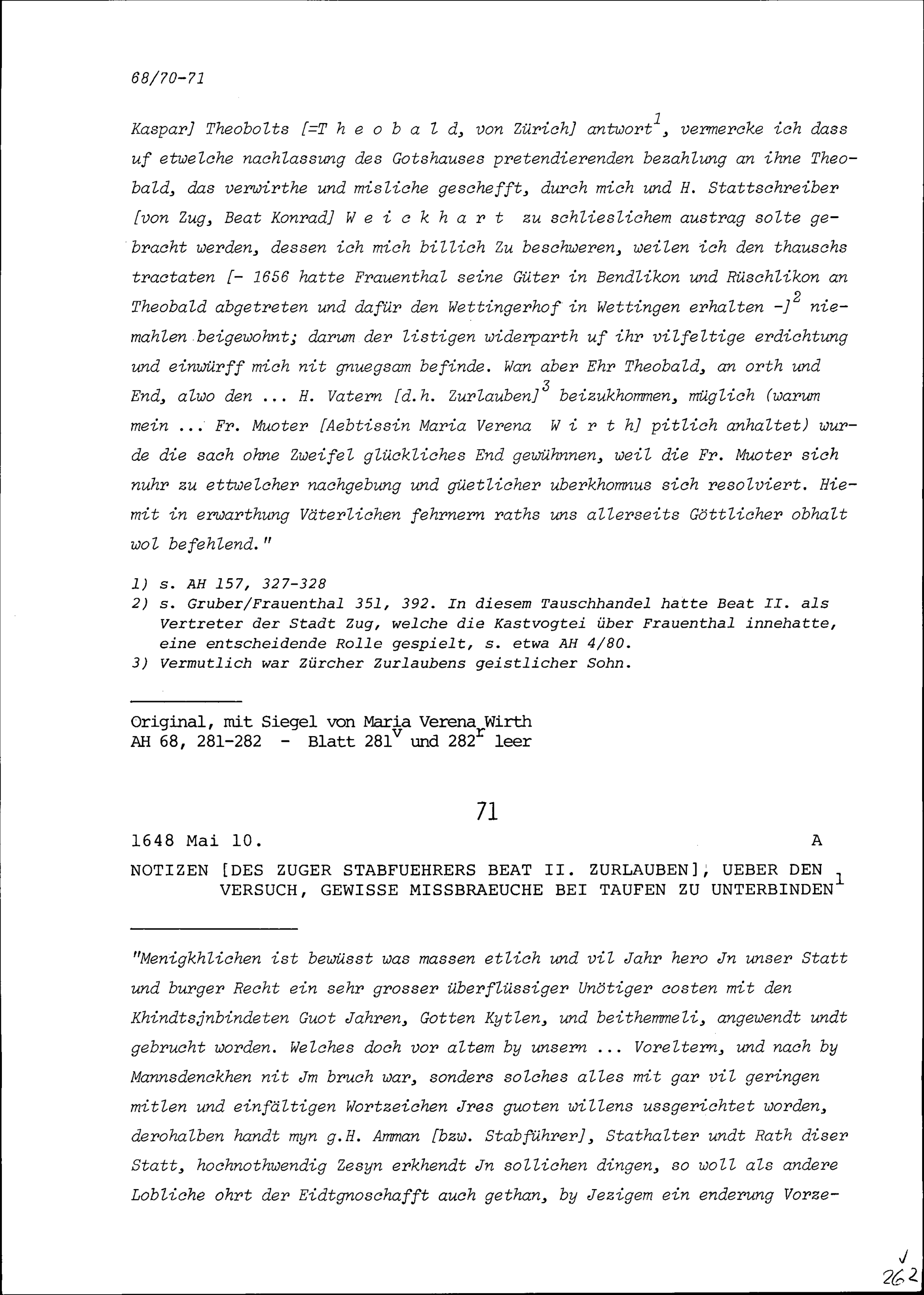 Notiz von Beat II. Zurlauben, Stabführer der Stadt Zug, über den Versuch gewisse Missbräuche bei Taufen zu unterbinden