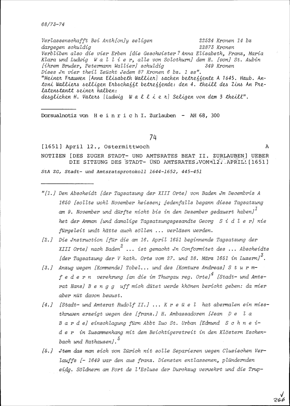 Notiz von Beat II. Zurlauben, Stadt- und Amtrat Zug, über die Sitzung des Stadt- und Amtrats 12 April 1651
