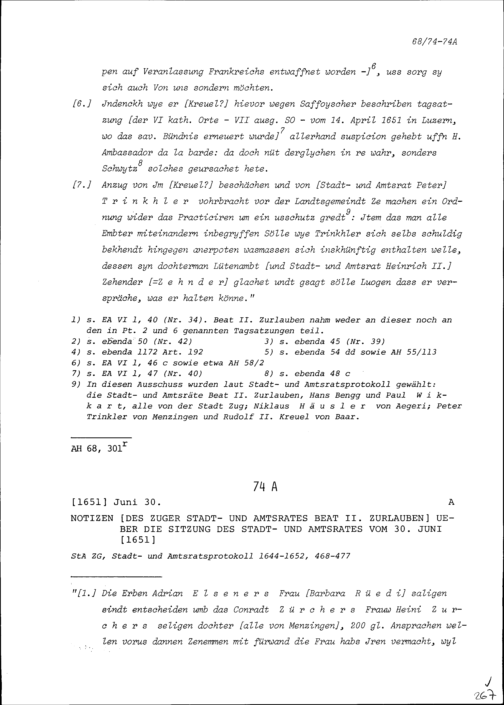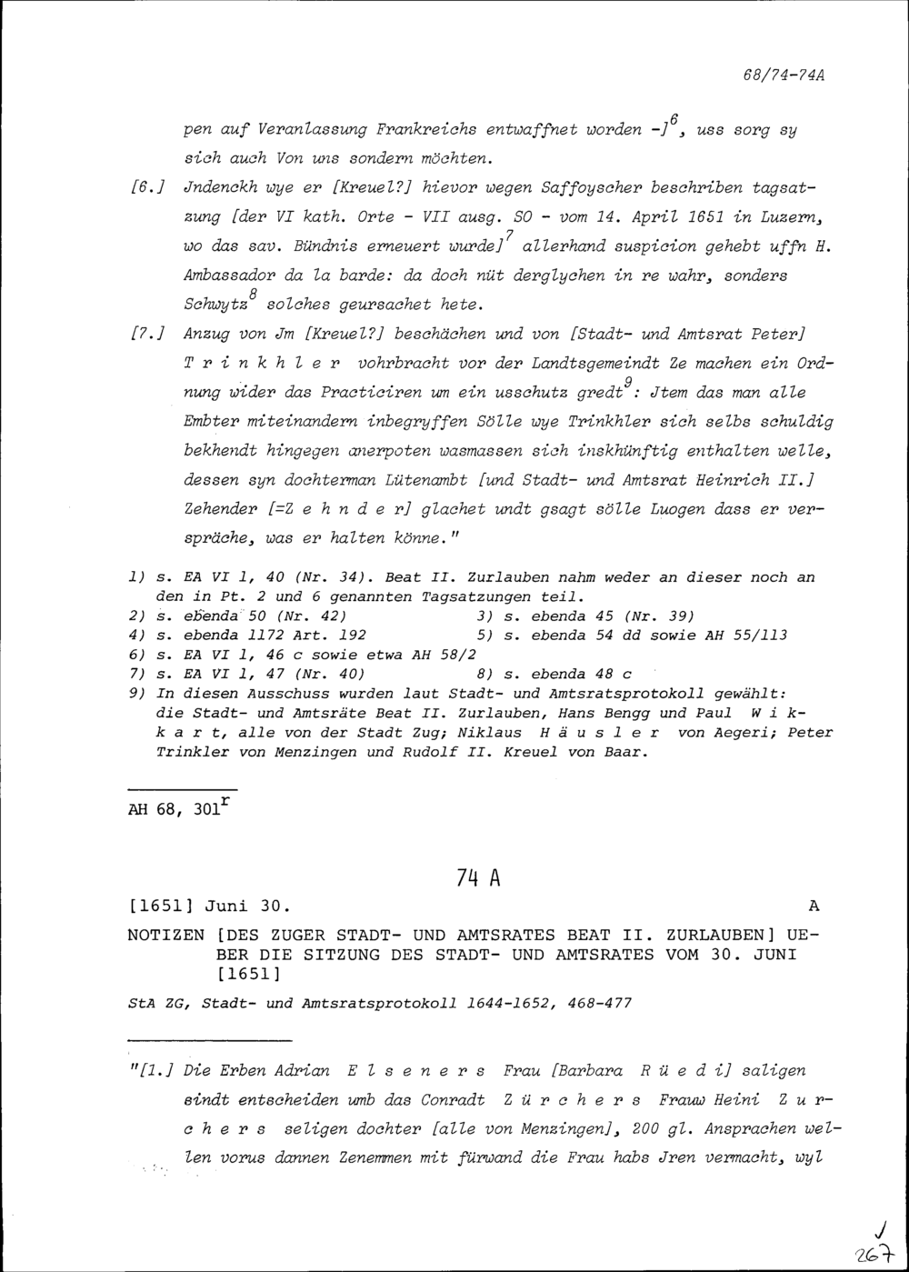 Notiz von Beat II. Zurlauben, Stadt- und Amtrat Zug, über die Sitzung des Stadt- und Amtrats vom 30. Juni 1651