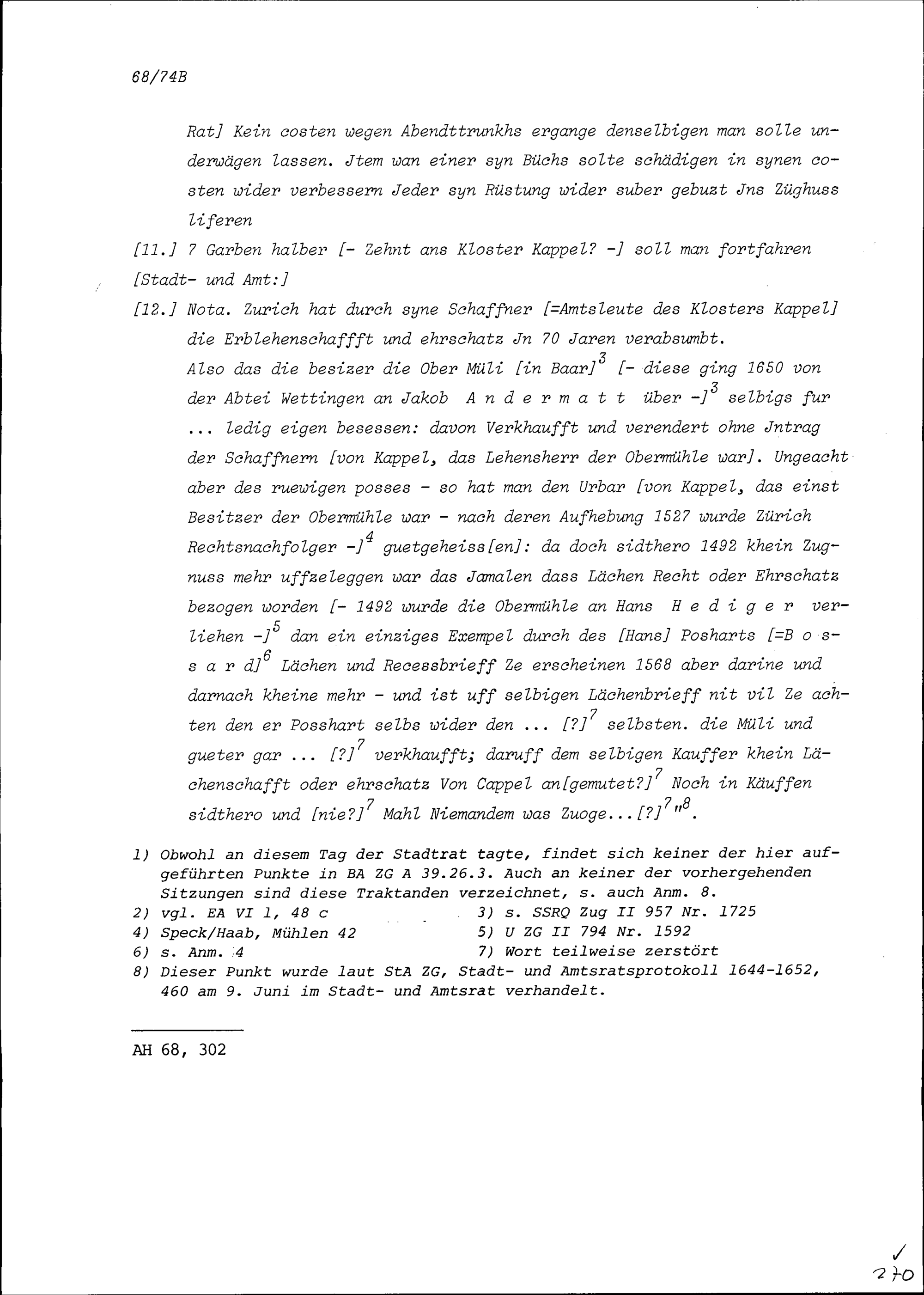 Notiz von Beat II. Zurlauben, Zuger Stabführer und Stadt- und Amtrat, über die Sitzung des Stadtrats vom 3. Juni 1651 beziehungsweise des Stadt- und Amtrats vom 9. Juni 1651