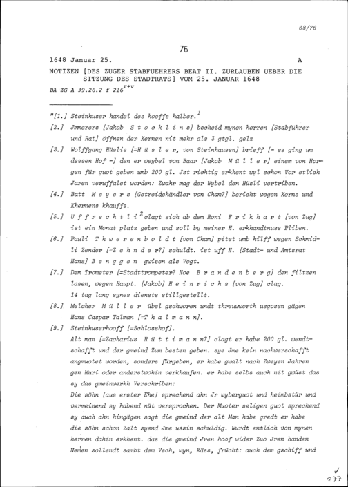 Notiz von Beat II. Zurlauben, Stabführer der Stadt Zug, über die Sitzung des Stadtrats vom 25. Januar 164 8