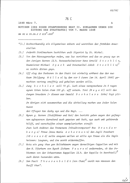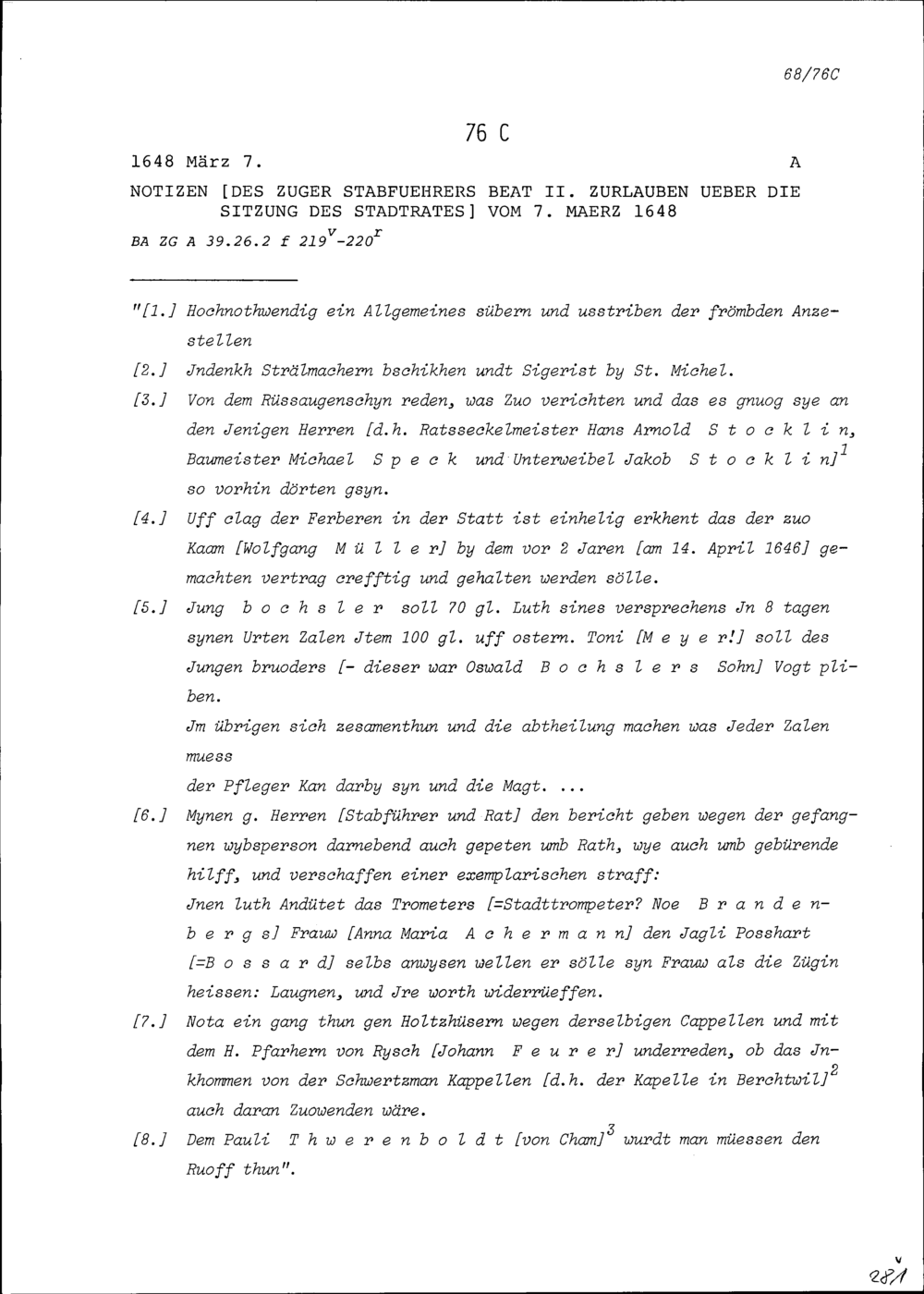 Notiz von Beat II. Zurlauben, Stabführer der Stadt Zug, über die Sitzung des Stadtrats vom 7. März 1648