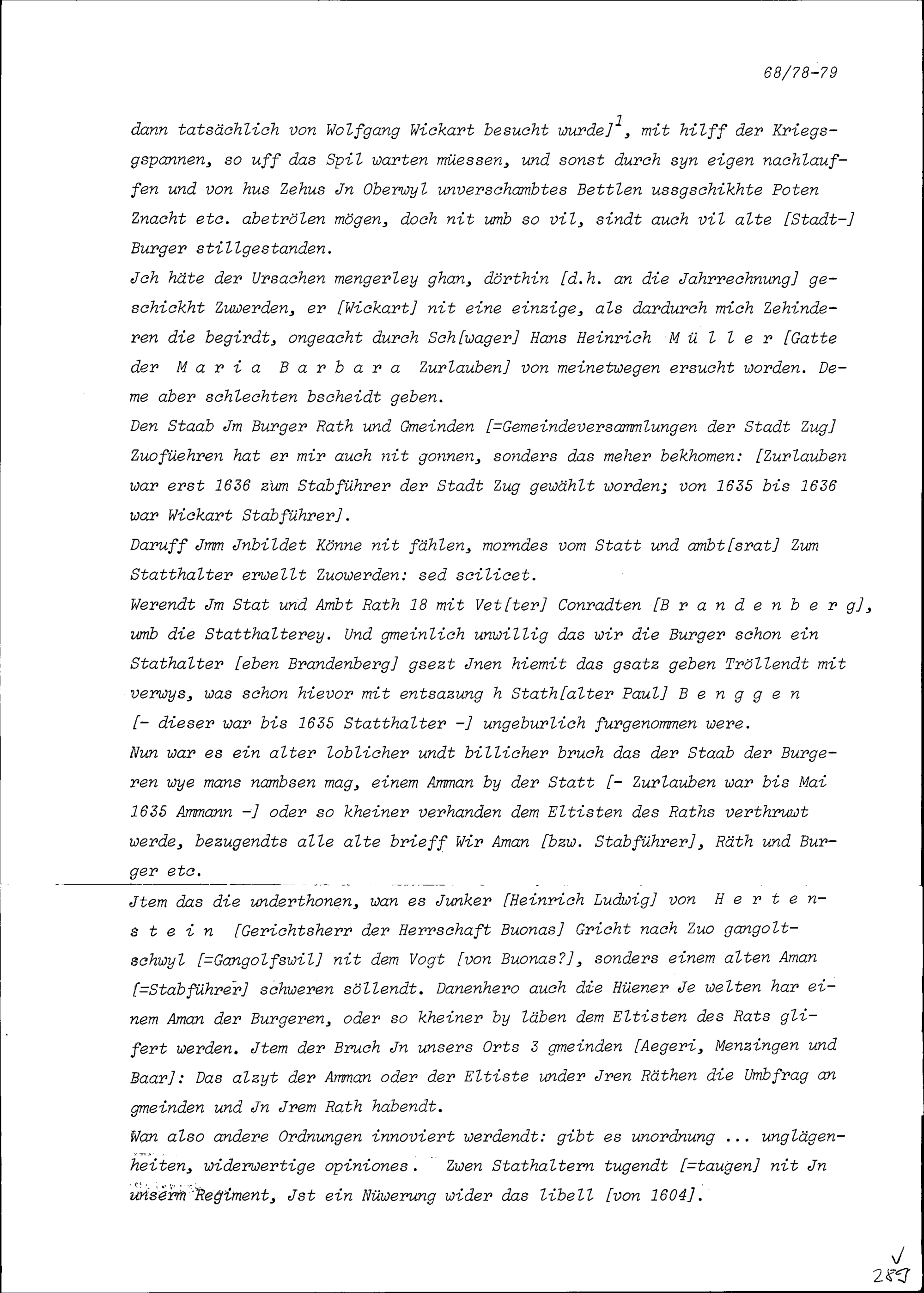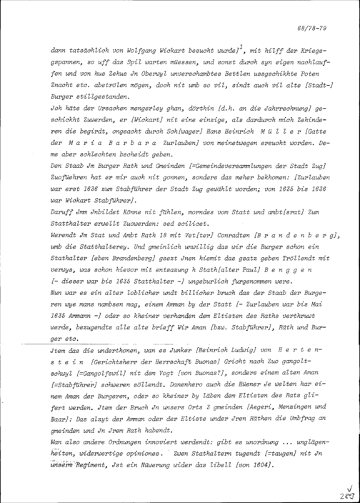 Notiz von Beat II. Zurlauben, Stadt- und Amtrat Zug, insbesondere über die gegen Zurlauben gerichteten Aktivitäten von Wolfgang Wickart, Stadt- und Amtrat