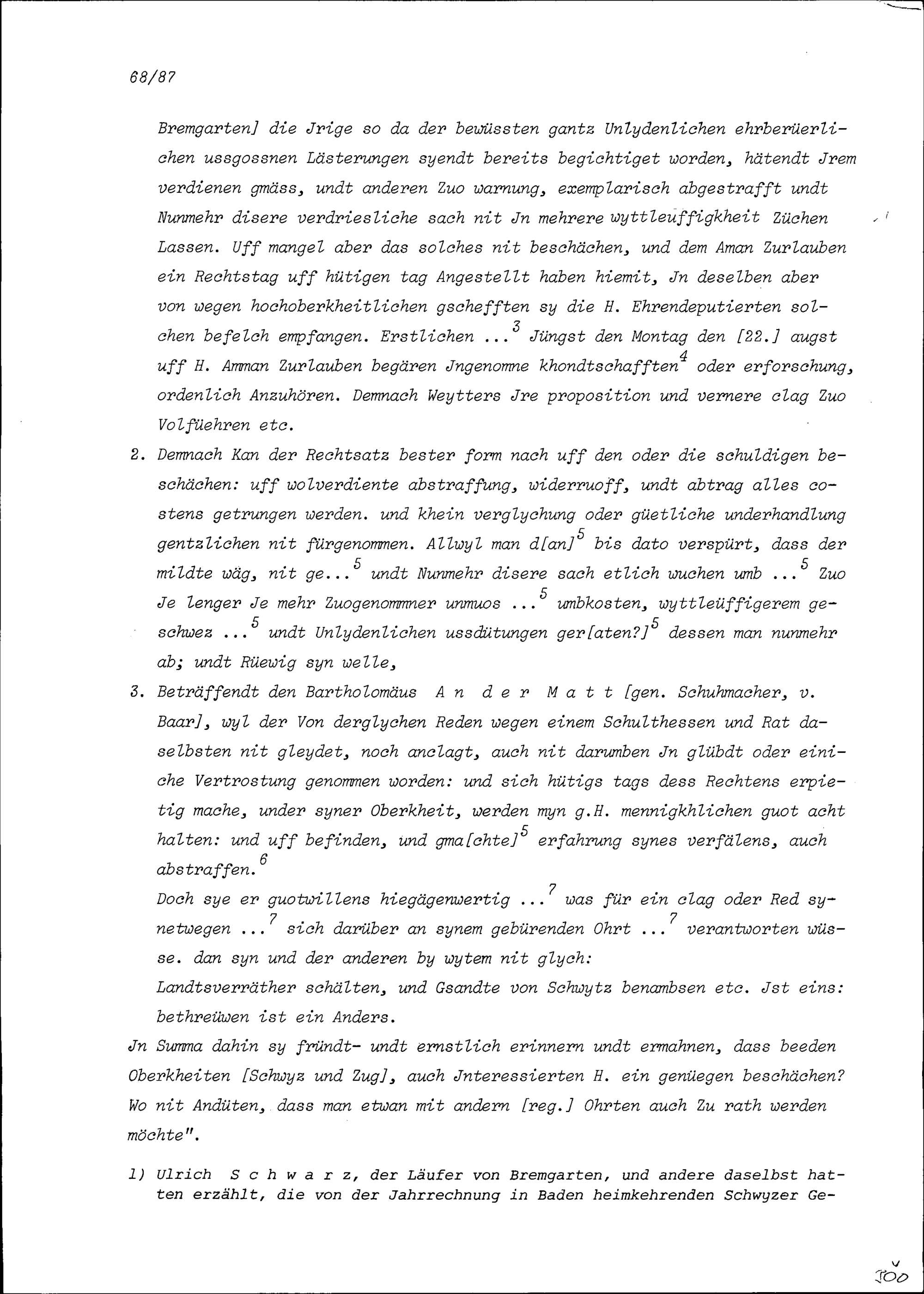 Instruktion des Ammanns und Rats von Stadt und Amt Zug für die Gesandten nach Bremgarten, abzuklären, wer gegen Beat II. Zurlauben, Ammann, ehrverletzliche Worte ausgestossen hatte