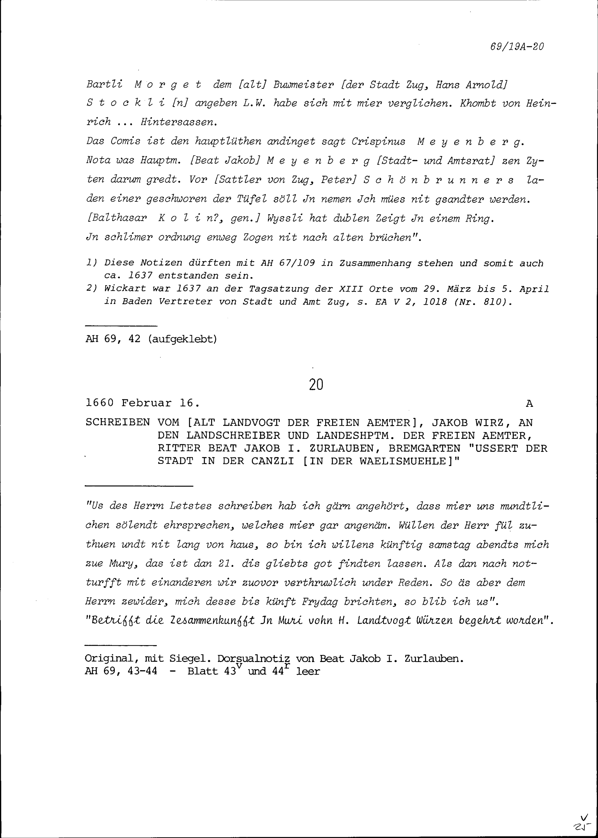 Schreiben von Jakob Wirz, Altlandvogt der Freien Ämter, an Beat Jakob I. Zurlauben, Landschreiber und Landeshauptmann der Freien Ämter, Bremgarten in der Kanzlei Wälismühle