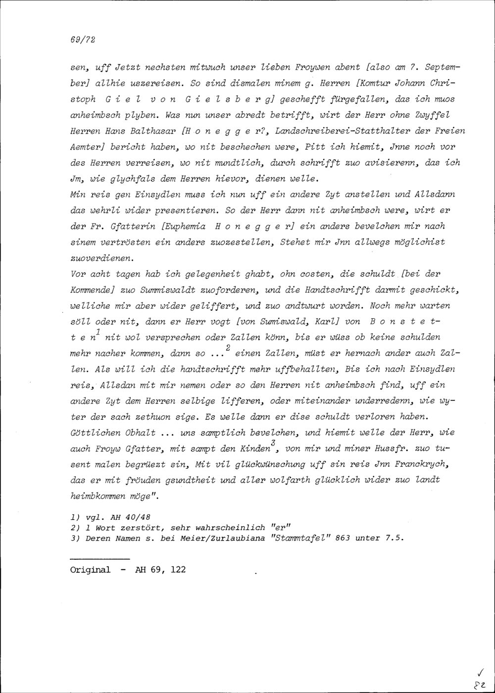 Schreiben von Uriel Seiwitt, Schreiber der Kommende Hitzkirch, an Beat II. Zurlauben, Ammann und Gardehauptmann, Zug