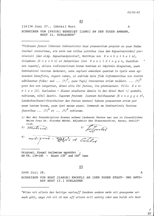 Schreiben von Benedikt Lang, Prior von Muri, an Beat II. Zurlauben, Ammann Zug