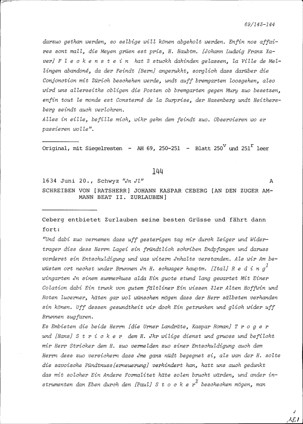 Schreiben von Johann Kaspar Ceberg, Ratsherr, an Beat II. Zurlauben, Ammann Zug