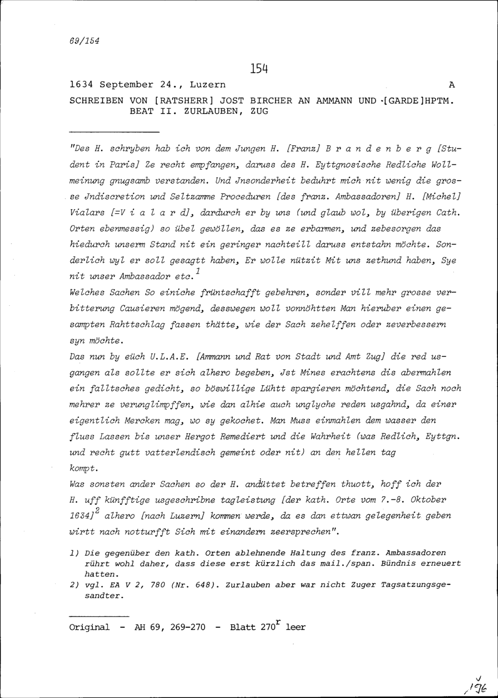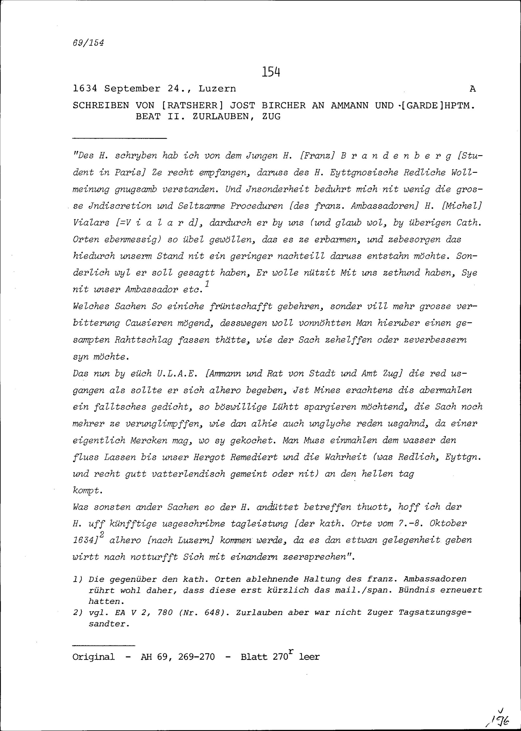 Schreiben von Jost Bircher, Ratsherr, an Beat II. Zurlauben, Ammann und Gardehauptmann, Zug