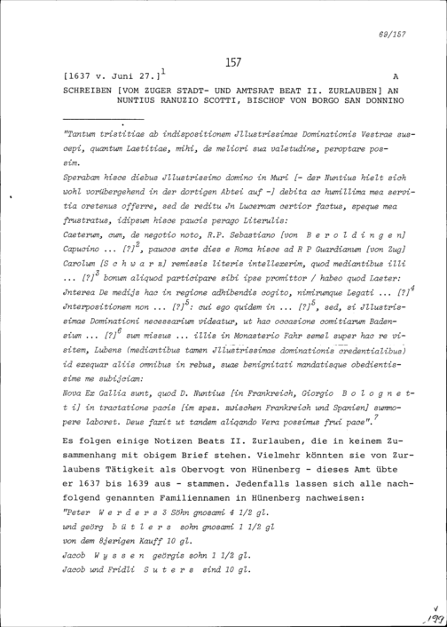 Schreiben von Beat II. Zurlauben, Stadt- und Amtrat Zug, an Ranuzio Scotti, Nuntius und Bischof von Borgo San Donnino