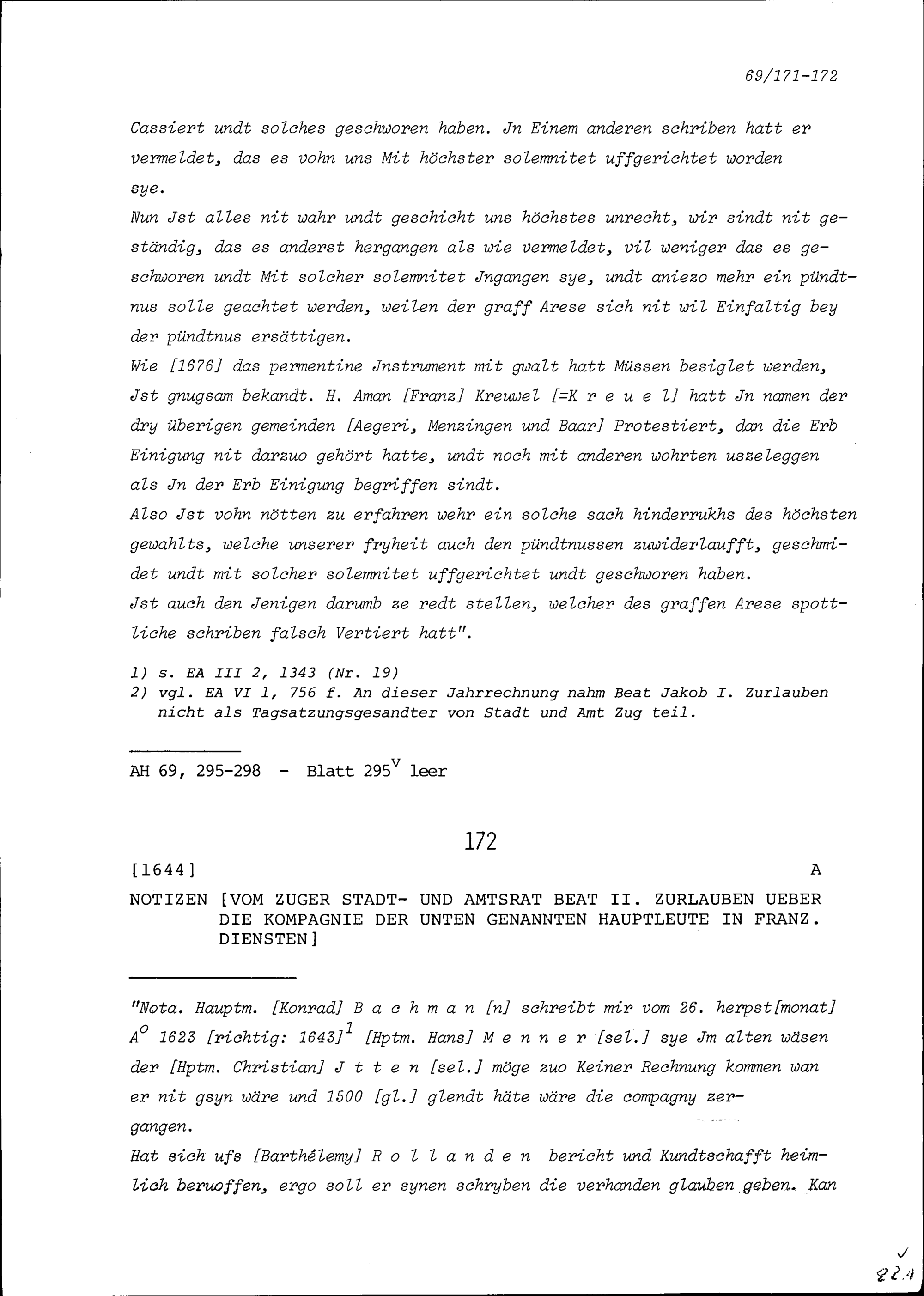 Notiz von Beat II. Zurlauben, Stadt- und Amtrat Zug, über eine Kompanie in französischen...