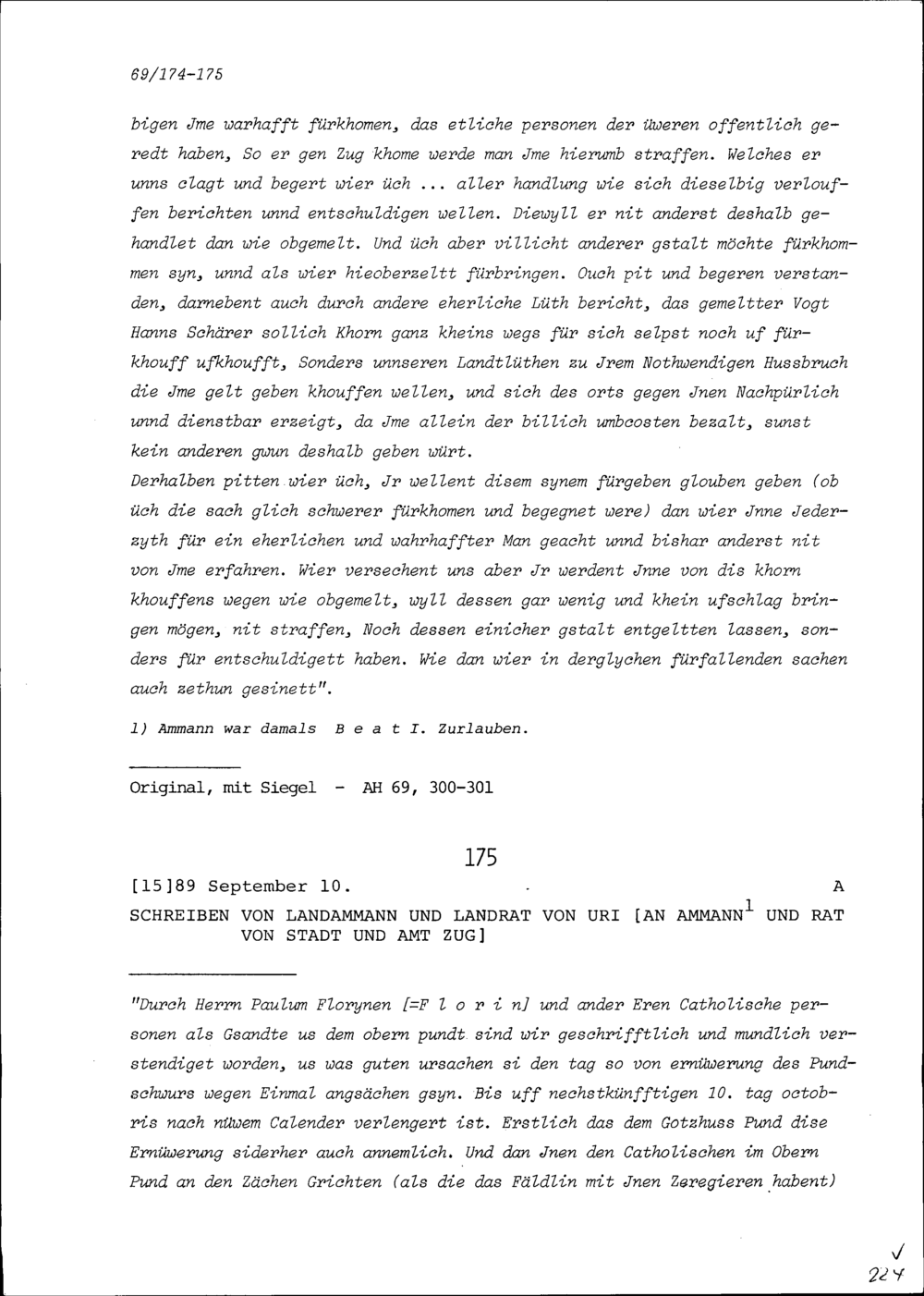 Schreiben des Landammanns und Landrats Uri an Ammann und Rat von Stadt und Amt Z...