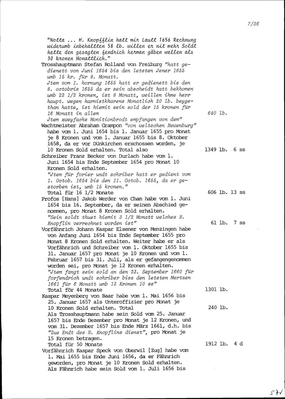 Offiziersetat der Kompanie Zurlauben für die Zeit von 1654 bis 1661, als Beat Jakob Knopfli, Junior, Hauptmann, und Heinrich II. Zurlauben, Hauptmann, obgenannte Kompanie gemeinsam führten