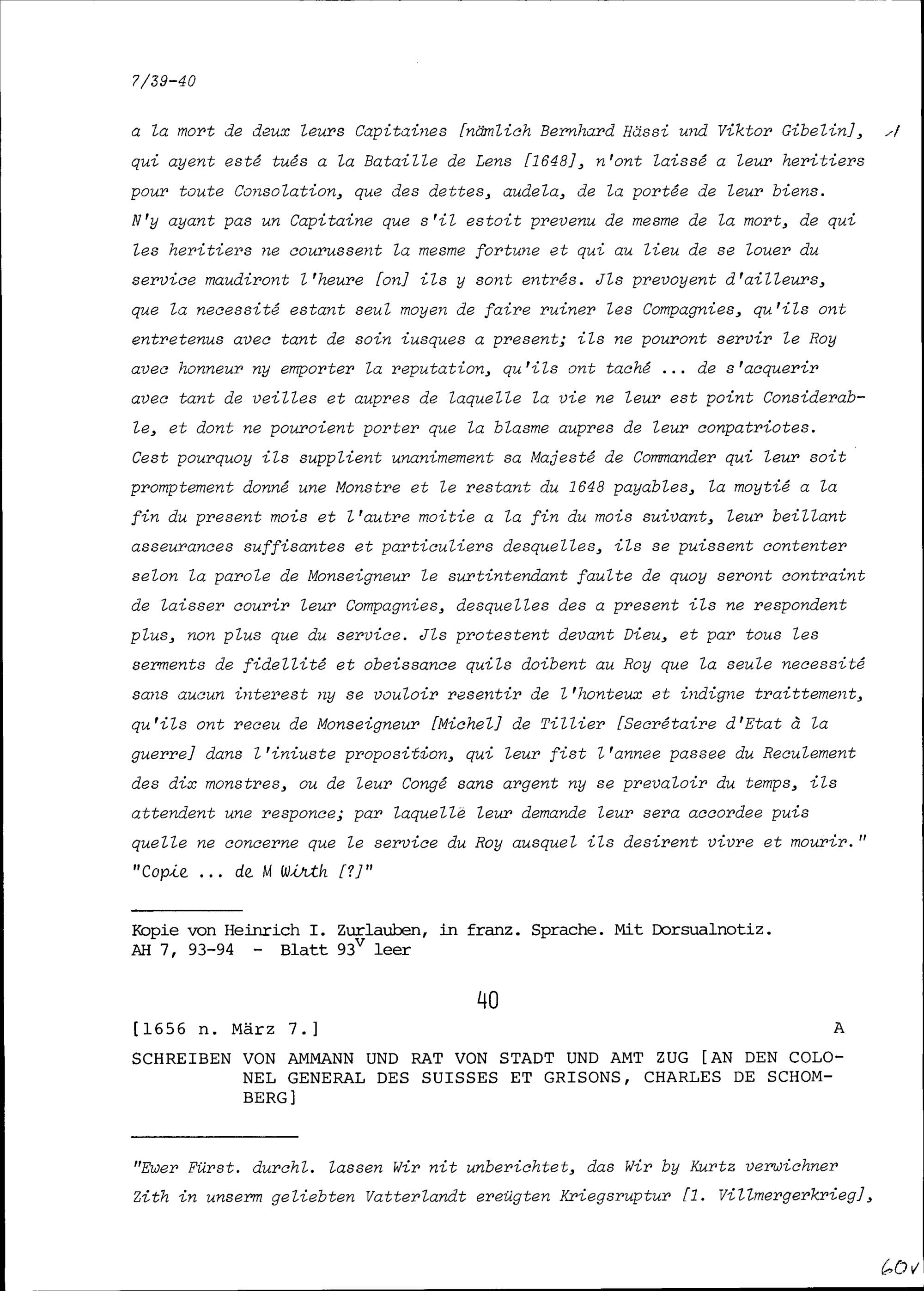 Schreiben des Ammanns und Rats von Stadt und Amt Zug an Karl von Schomberg, Kommandant...