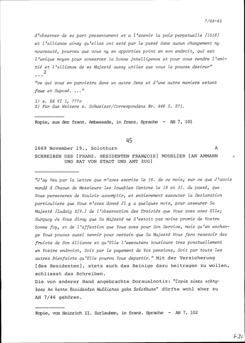 Schreiben von François Mouslier, Resident von Frankreich, an Ammann und Rat von Stadt und Amt Zug