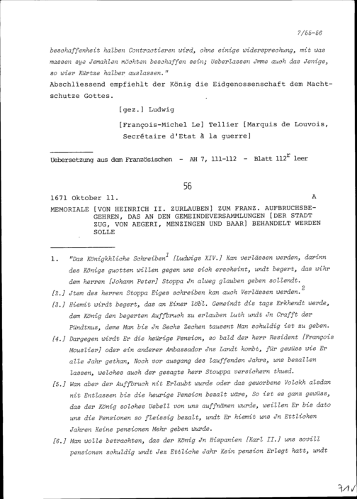 Bericht von Heinrich II. Zurlauben zum französischen Aufbruchsbegehren, das an den...