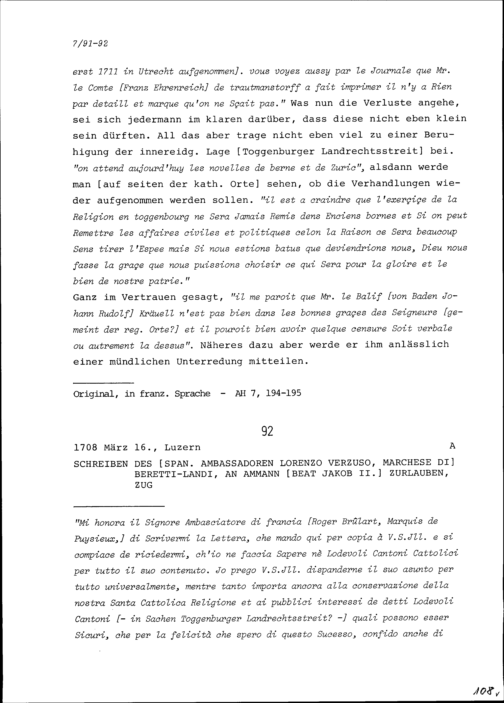 Schreiben von Lorenzo Verzuso, Marchese di Beretti-Landi, Ambassador von Spanien, an Beat Jakob II. Zurlauben, Ammann, Zug