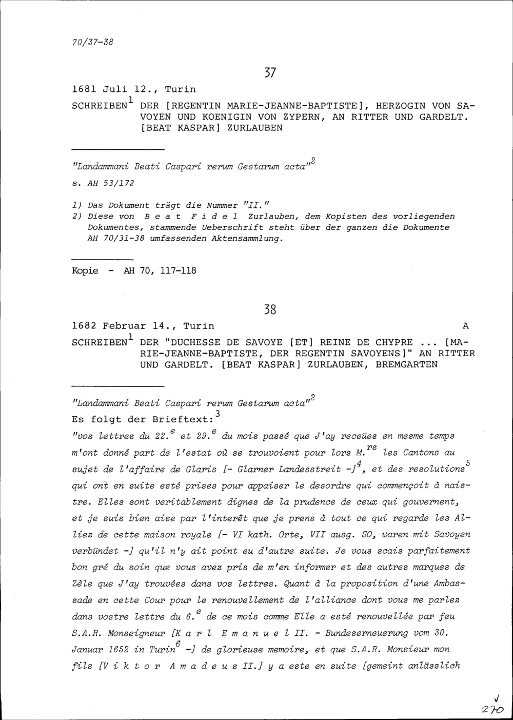 Schreiben von Marie-Jeanne-Baptiste, Regentin und Herzogin von Savoyen, an Beat Kaspar...