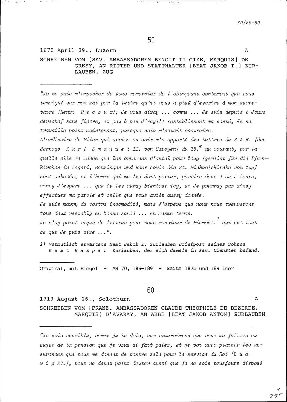 Schreiben von Benoît II. Cize, Marquis de Grésy, Ambassador von Savoyen, an Beat Jakob I. Zurlauben, Statthalter, Zug