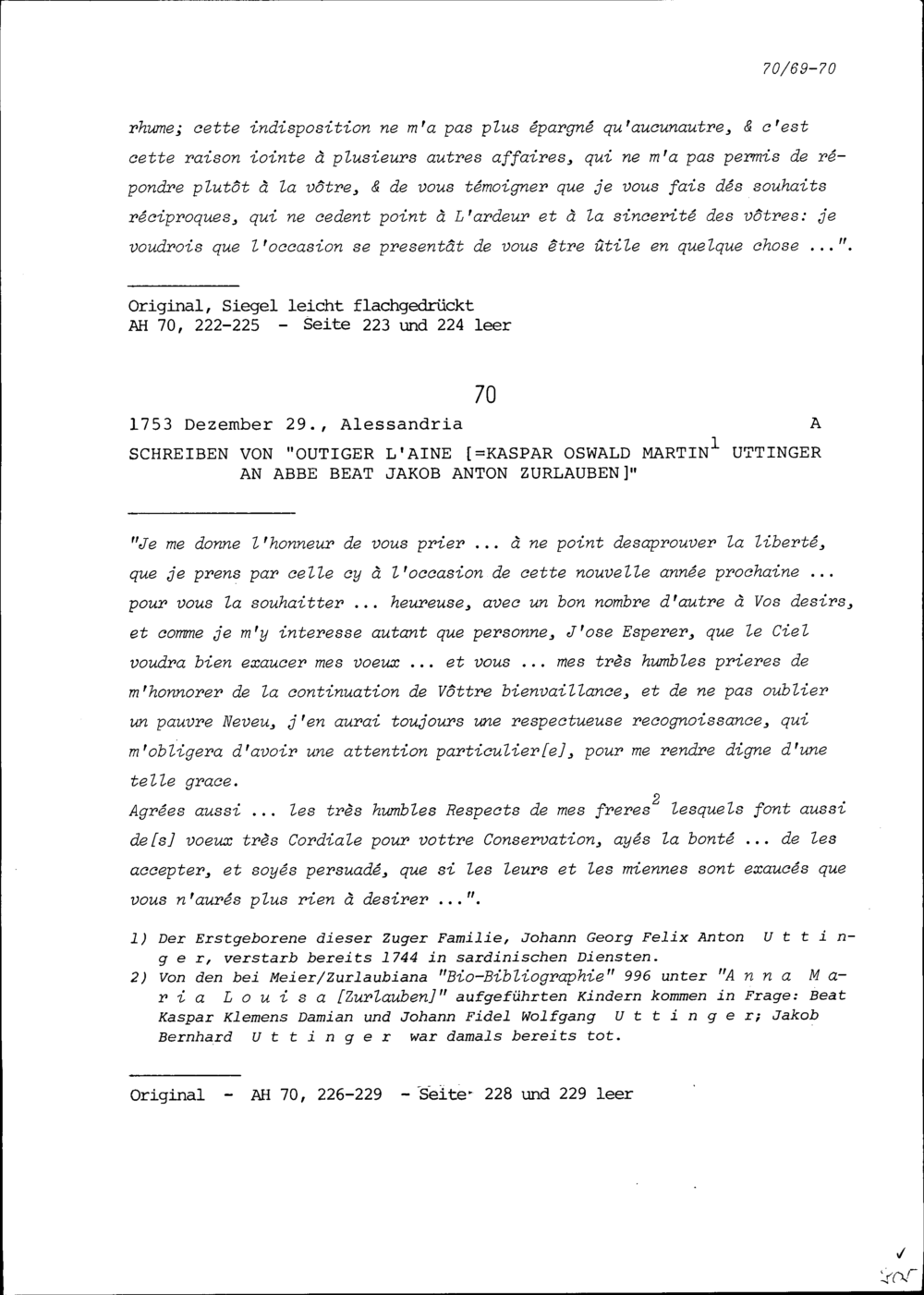 Schreiben von Kaspar Oswald Martin Uttinger an Beat Jakob Anton Zurlauben, Priester