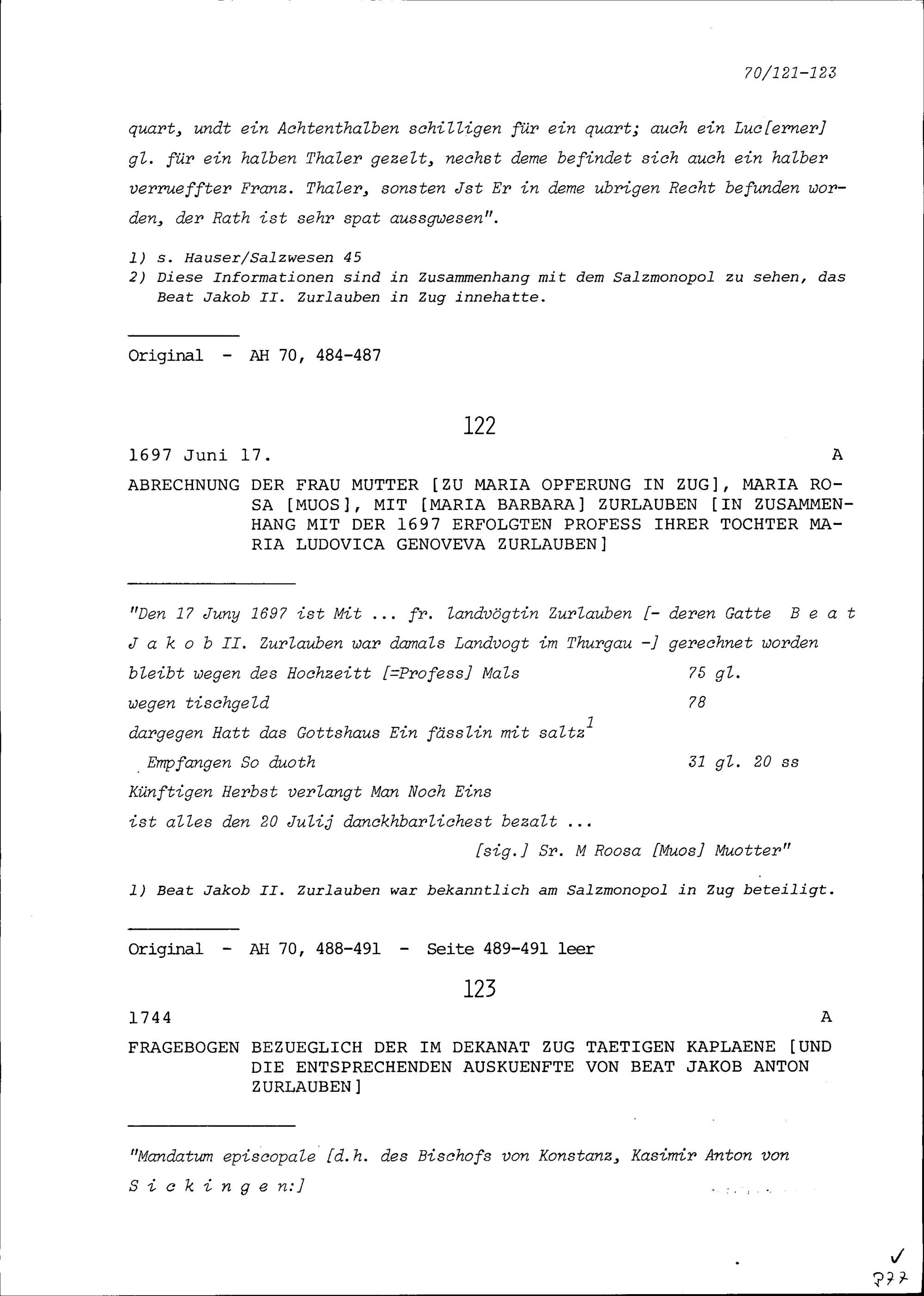 Abrechnung von Maria Rosa Muos, Frau Mutter zu Maria Opferung in Zug, mit Maria Barbara Zurlauben in Zusammenhang mit der 1697 erfolgten Profess ihrer Tochter Maria Ludovika Genoveva Zurlauben