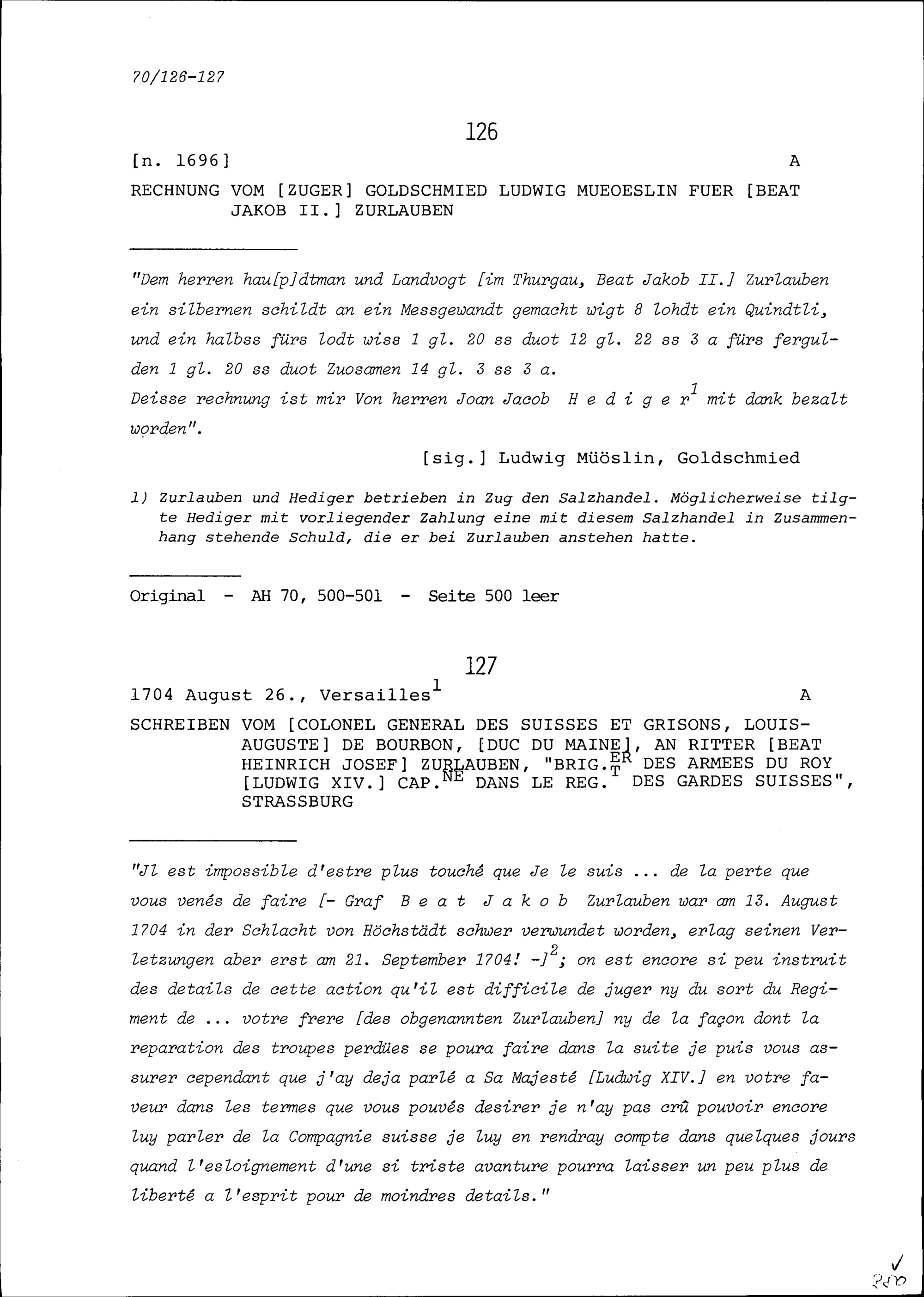 Rechnung von Ludwig Müöslin, Zuger Goldschmied, für Beat Jakob II. Zurlauben