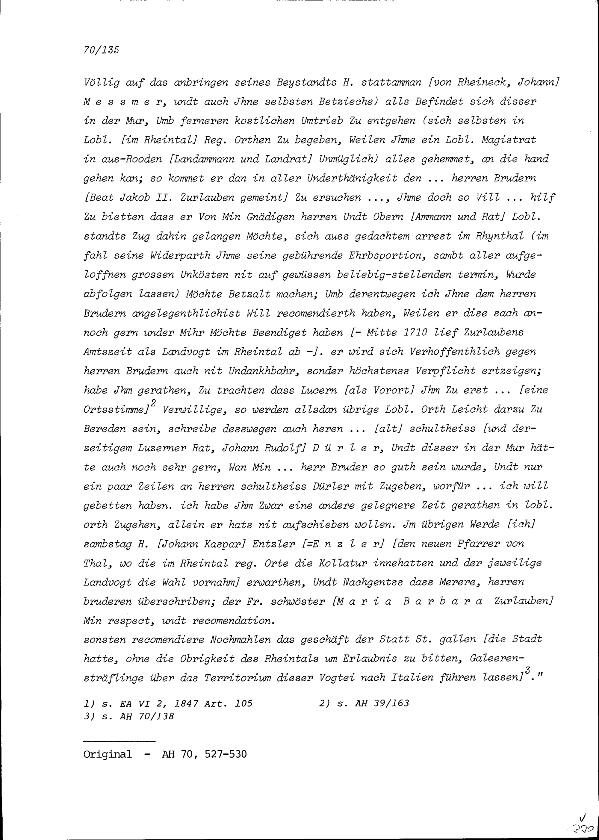 Schreiben von Fidel Zurlauben, Landvogt im Rheintal, an Beat Jakob II. Zurlauben, Altammann und Stadt- und Amtrat Zug