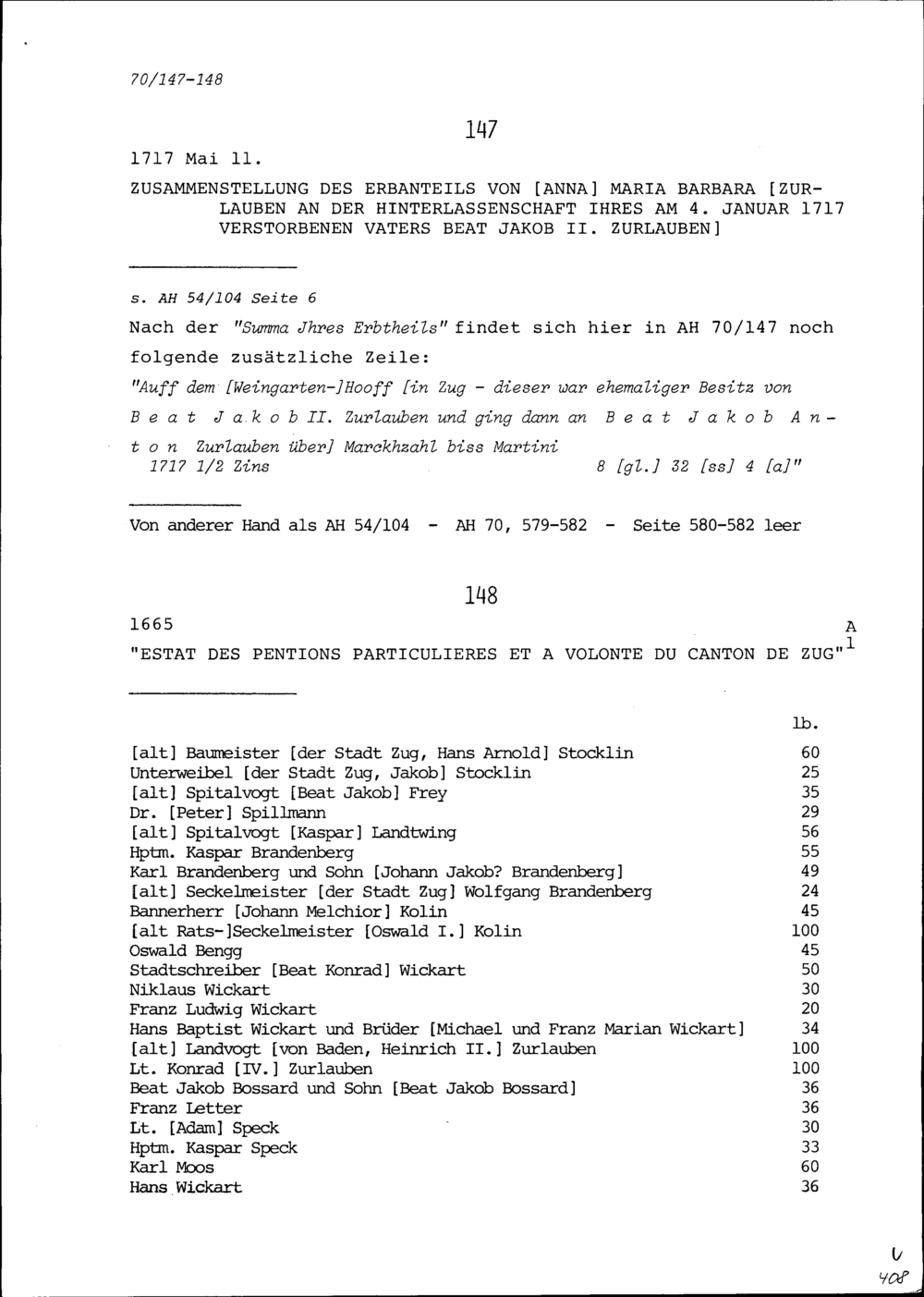 Zusammenstellung des Erbanteils von Anna Maria Barbara Zurlauben an der Hinterlassenschaft...
