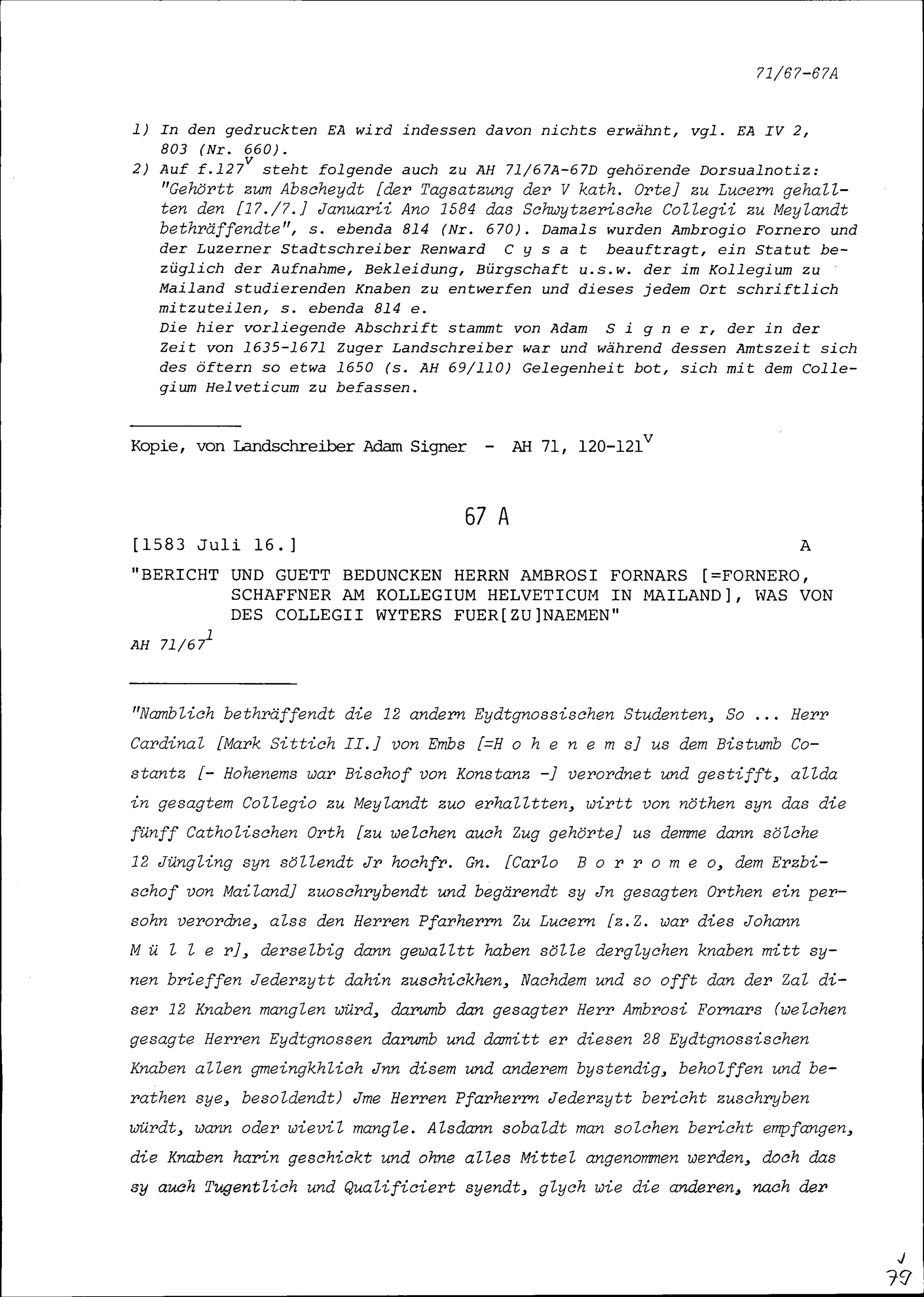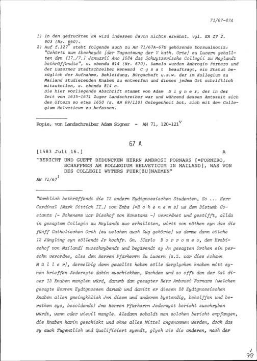 Bericht von Ambrosius Fornero, Schaffner am Kollegium Helveticum in Mailand