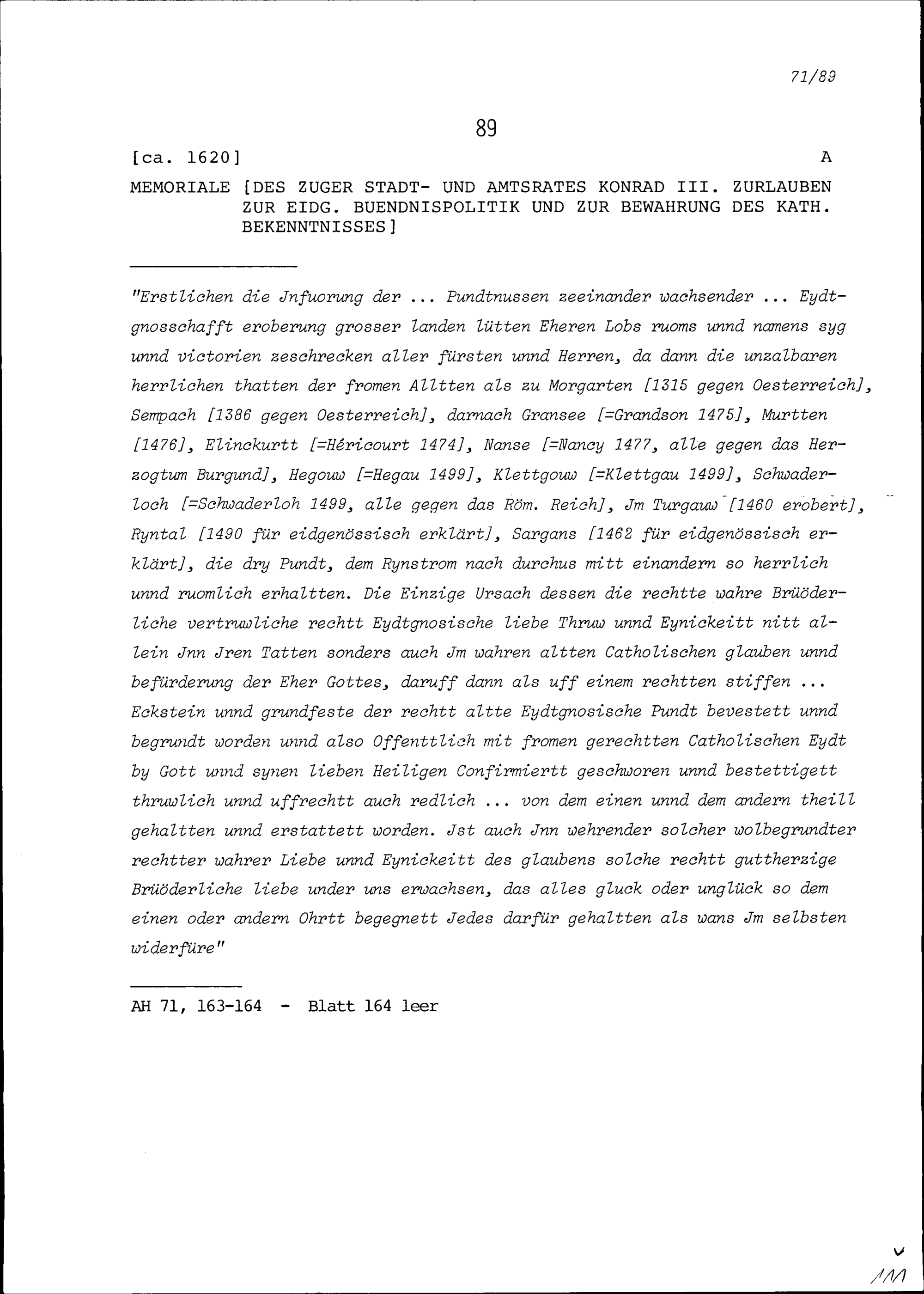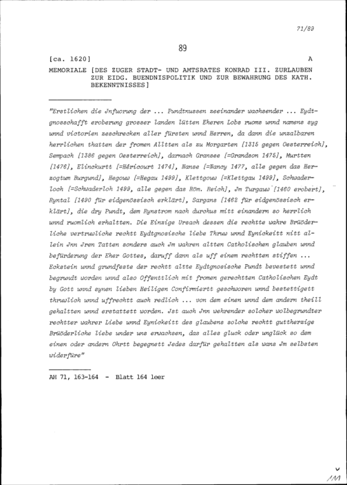 Bericht von Konrad III. Zurlauben, Stadt- und Amtrat Zug, zur eidgenössischen Bündnispolitik und zur Bewahrung des katholischen Bekenntnisses
