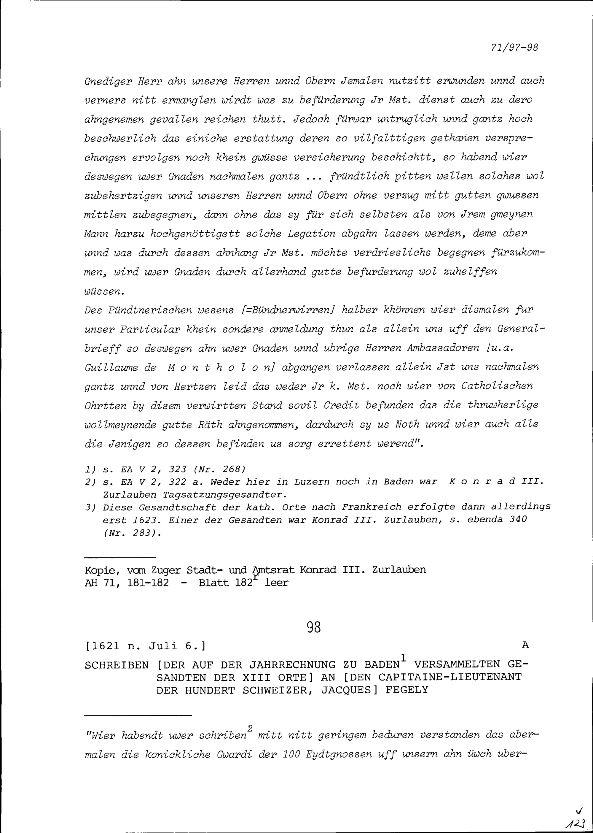Schreiben der Gesandten der Dreizehn Orte an Jacques Fégely, Kommandant der Hundertschweizer