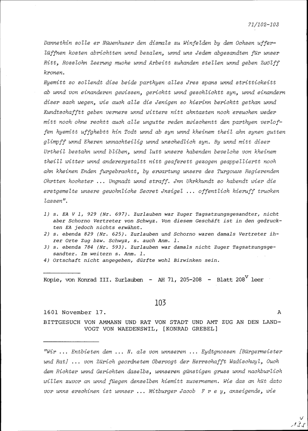 Bittgesuch des Ammanns und Rats von Stadt und Amt Zug an Konrad Grebel, Landvogt von Wädenswil